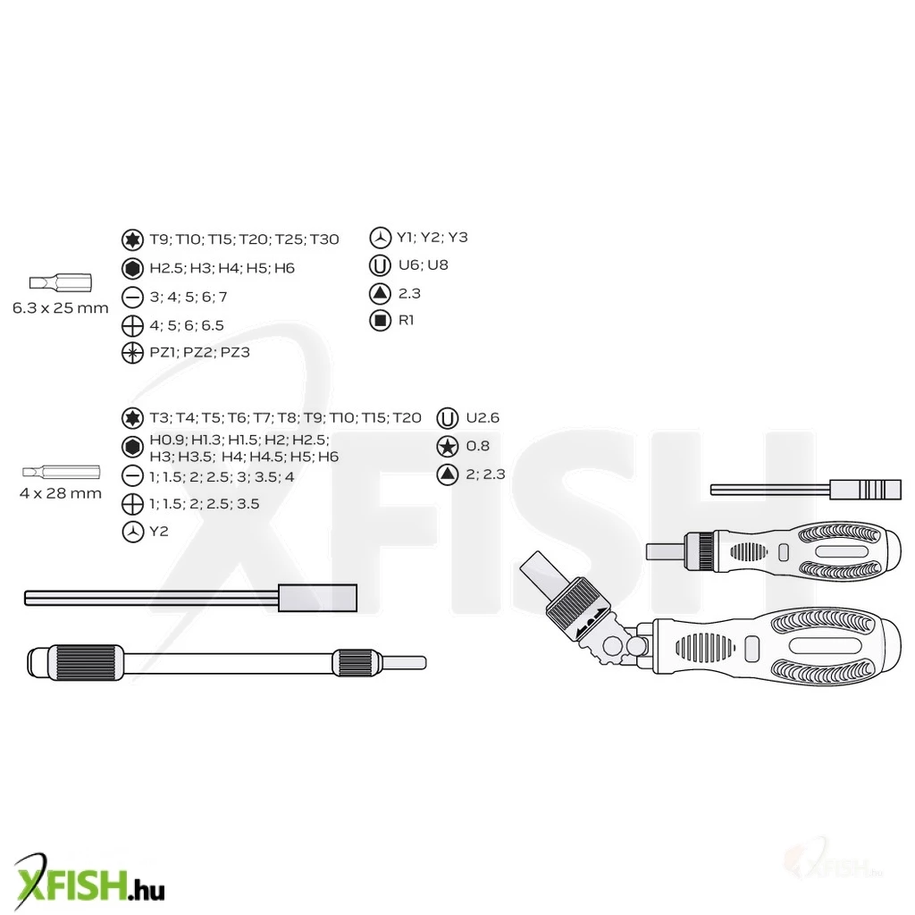 A 73 darabból álló készlet széles méret- és típusválasztékot kínál, így garantáltan megtalálható benne a megfelelő bit legyen szó bármilyen csavar típusról, amely egy horgászcsónakon, halradaron vagy más eszközön előfordulhat. A szett tartalmaz különféle SL, PH, TORX, HEX, YO, U és PZ biteket különböző méretekben, valamint precíz TORX biteket, amelyek különösen hasznosak a finomabb munkálatok során. A háromszög, csillag és egyéb kevésbé megszokott bitek segítséget nyújtanak speciális feladatoknál, amikor egyedi csavarfejekkel találod magad szemben.