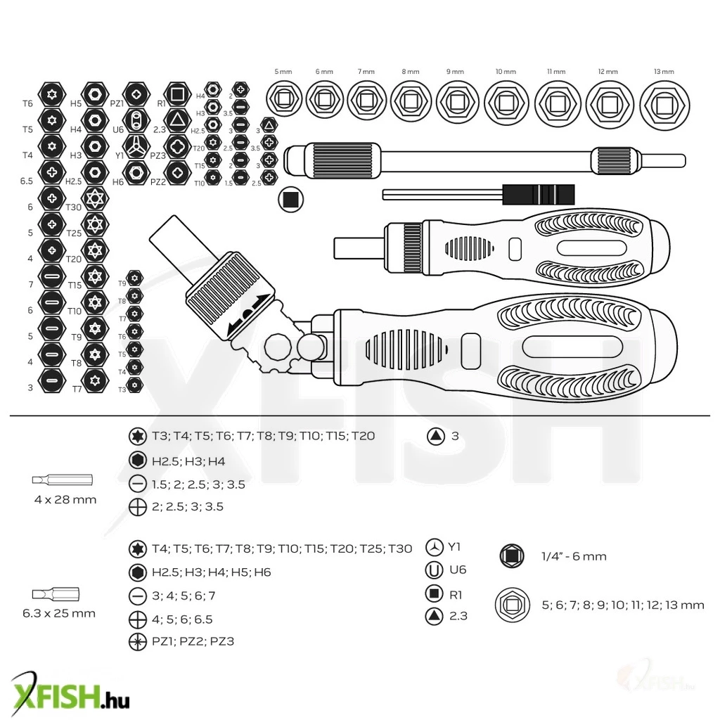 A készlet precíz bitek széles választékával van ellátva, amelyek különböző típusú és méretű csavarokhoz alkalmazkodnak, így szinte bármilyen munkafeladat elvégzésére alkalmasak. A dugókulcsok különböző méretűek, kezdve az M5.0-tól egészen az M13-ig, biztosítva a kompatibilitást különböző csavarméretekkel.