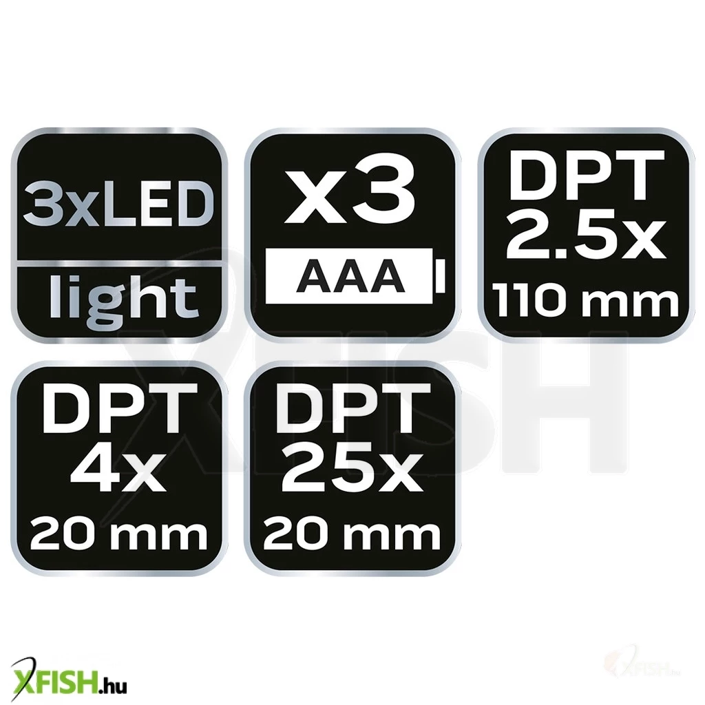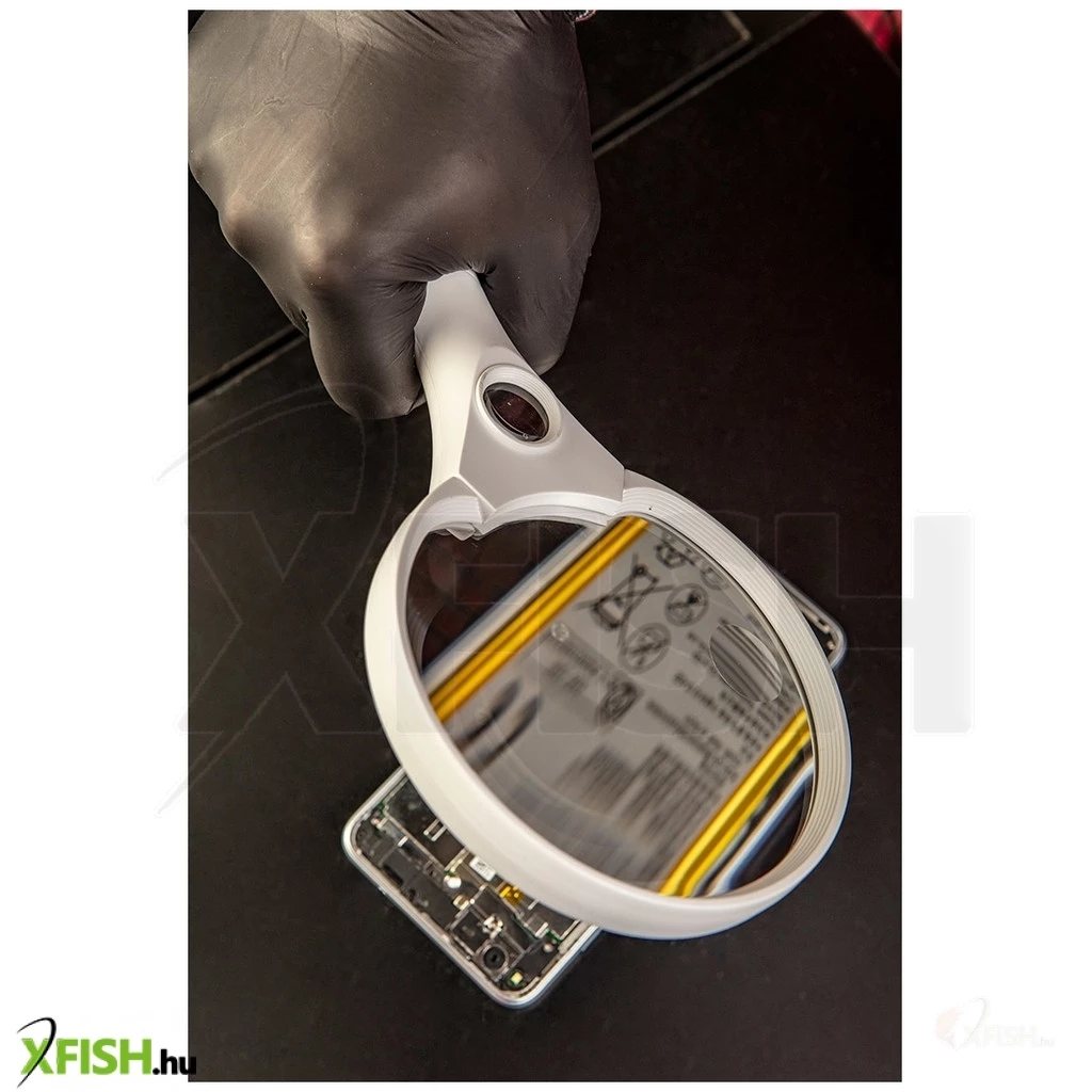 A beépített 3 LED-es világítás segít kiemelni a vizsgált területet, így sötétebb környezetben is könnyedén dolgozhatunk vele. A nagyító műanyag fogantyúval rendelkezik, amely kényelmes és biztos fogást nyújt. Az eszköz működéséhez három darab AAA elem szükséges, biztosítva a tartós használatot.