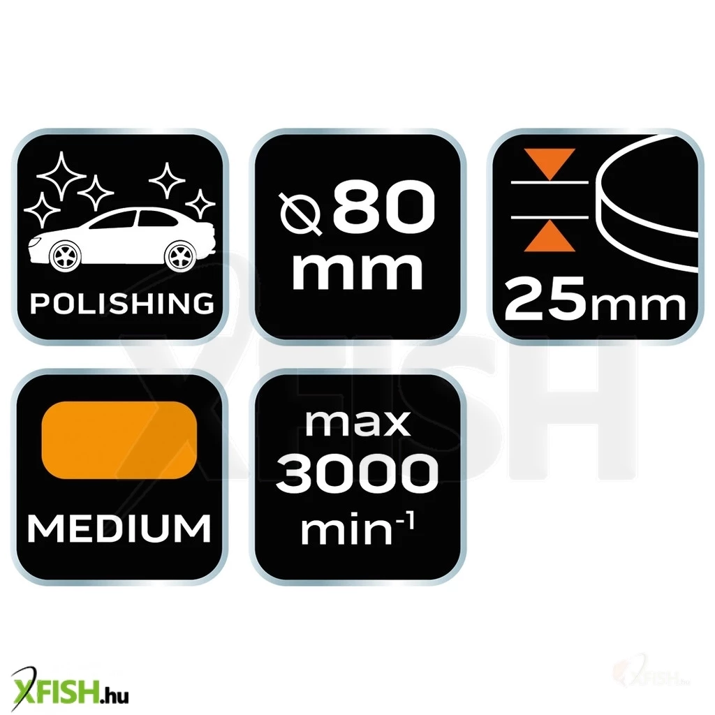 A polírkorong 80 mm átmérője és 25 mm vastagsága ideális a nehezen hozzáférhető helyek vagy kis alapterületű elemek precíz polírozására. Ennek a remek méretnek köszönhetően bármilyen felületen kiváló eredmény érhető el, legyen szó akár autók karosszériájáról, akár bútordarabok finomításáról. Az alkalmazható maximális fordulatszám 3000 rpm, amely biztosítja a hatékony és gyors munkavégzést, megőrizve a szivacs integritását.