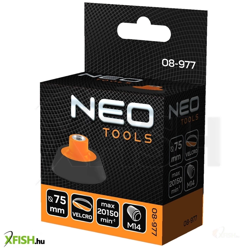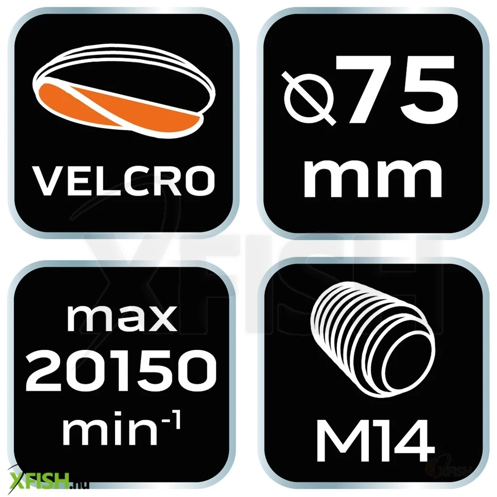 A Neotools felfogató tárcsa különösen hasznos azok számára, akik maximális hatékonysággal szeretnének dolgozni, hiszen akár 20150 fordulat/perc sebességgel is képes működni. A M14 mentes rögzítésű rendszerével a stabilitás és biztonság garantált, míg a tépőzáras rögzítés gyors és egyszerű cserét tesz lehetővé a polírpárnák között. Kompatibilis a NEO TOOLS 80 x 25 mm-es sorozatú polírpárnáival, beleértve a 08-974 és 08-976 cikkszámú modelleket is, amelyek tökéletesen illeszkednek a tárcsa 75 mm-es rögzítési átmérőjéhez.