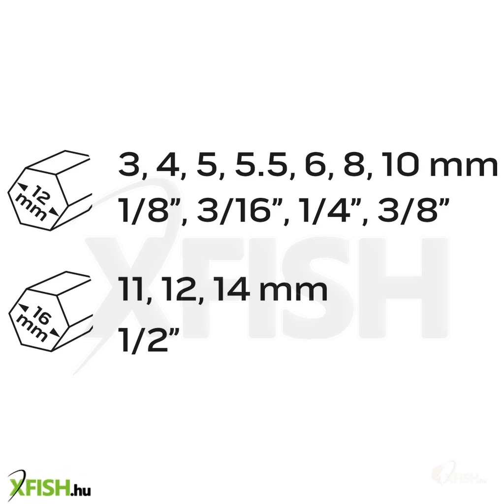 - 16 mm fejjel: 11 mm, 12 mm, 14 mm, 1/2"