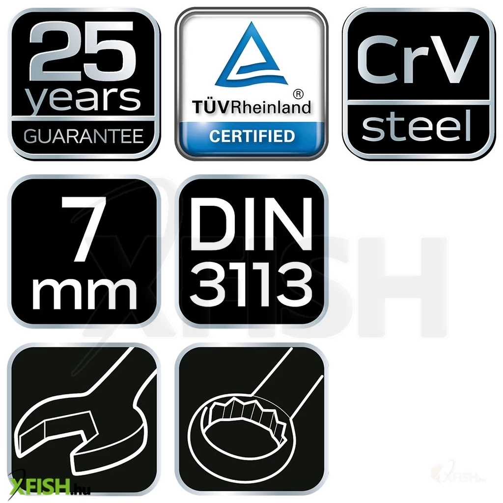 A Neotools csillag-villáskulcs 7x110mm egy kiváló minőségű kézi szerszám, amely a horgászok és barkácsolók mindennapi szükségleteit célozza meg. A termék a megbízhatóság és a tartósság jegyében készült, ami a króm-vanádium (CrV) acél felhasználásának eredménye. Az anyag jellemzője, hogy ellenáll a korróziónak, ezzel garantálva a kulcs hosszú élettartamát, még nehéz körülmények között is. A csillag-villáskulcs a DIN 3113 szabvány szerint készült, ami a termék magas színvonalát és szabványokon alapuló megbízhatóságát biztosítja.