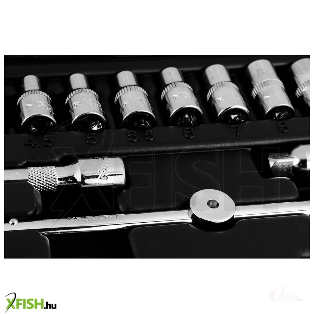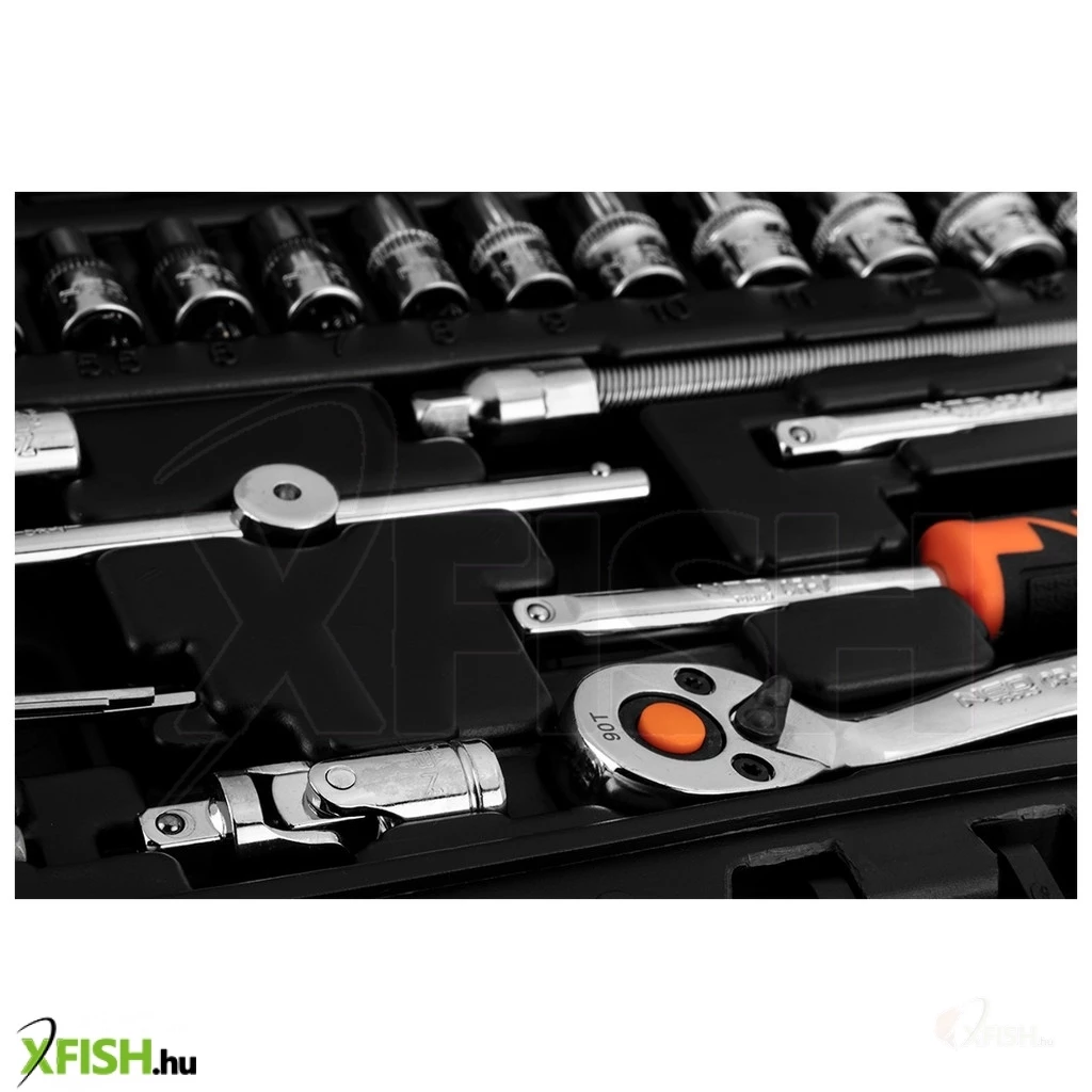A dugókulcsok és a hozzá tartozó elemek króm-vanádium acélból készültek, amely ellenáll a rozsdának és a korróziónak, így alkalmasak akár nedves környezetben vagy szabadtéri munkák során történő használatra is. A készlet gazdag választékot kínál különböző méretű fejekkel, lehetővé téve a sokféle csavar és anya gyors és hatékony meghúzását vagy kilazítását.