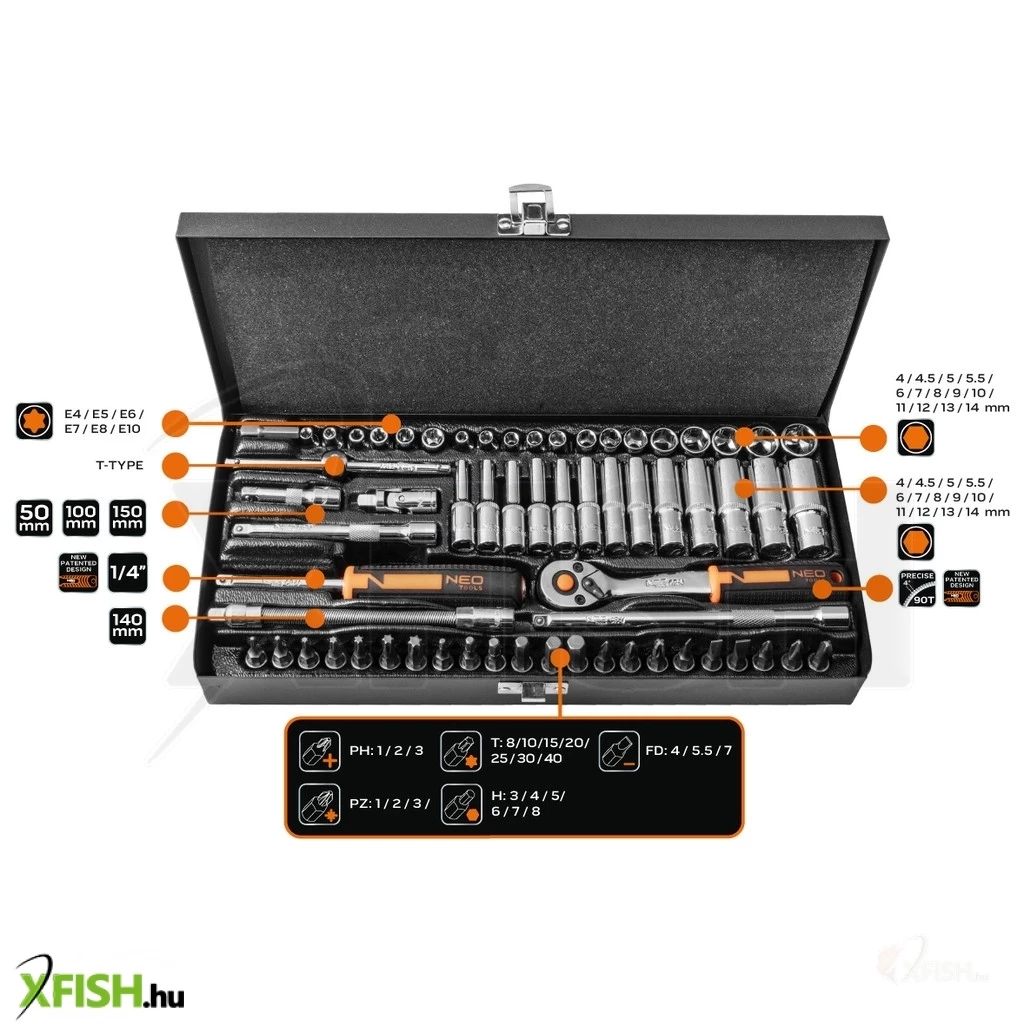 KategóriákKategóriákKerti szerszámok, eszközök Kulcsok Neotools dugókulcskészlet + bitkészlet 1/4 63db