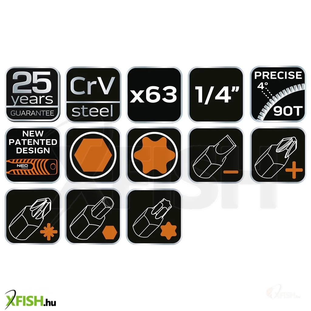 Neotools dugókulcskészlet + bitkészlet 1/4 63db