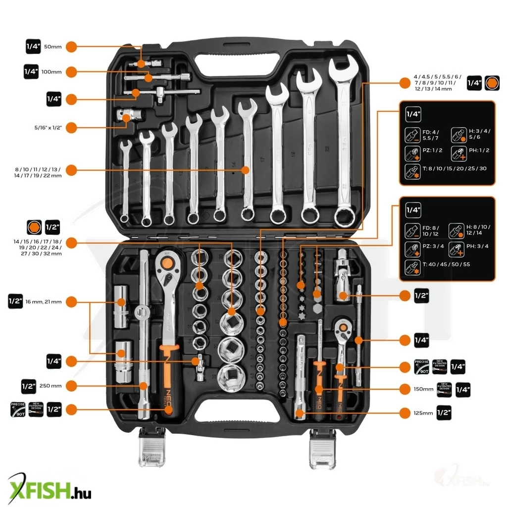 KategóriákKategóriákKerti szerszámok, eszközök Kulcsok Neotools dugókulcskészlet + szerszámkészlet 1/2, 1/4, 82db