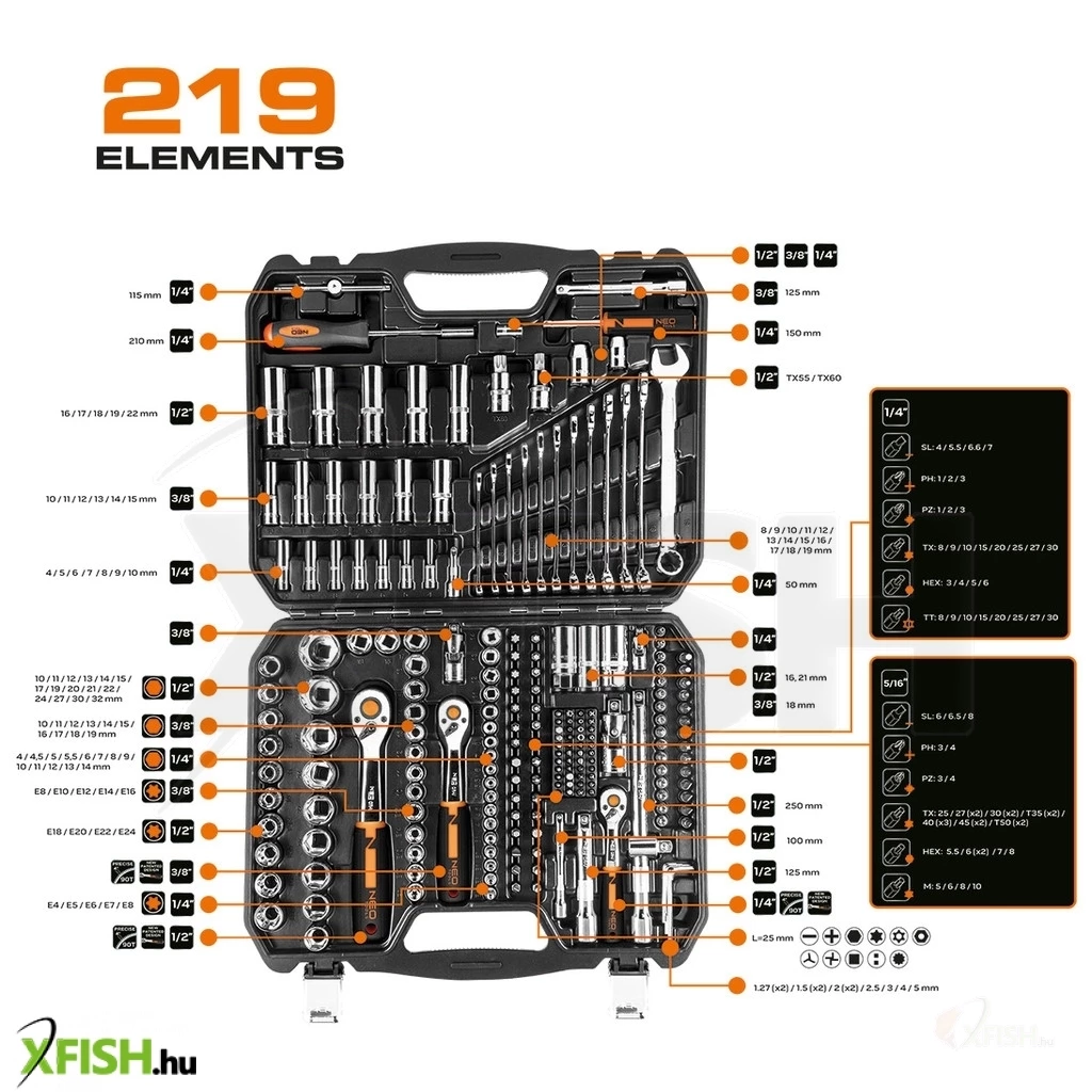 KategóriákKategóriákKerti szerszámok, eszközök Kulcsok Neotools dugókulcskészlet + szerszámkészlet 1/4, 3/8, 1/2, 219db