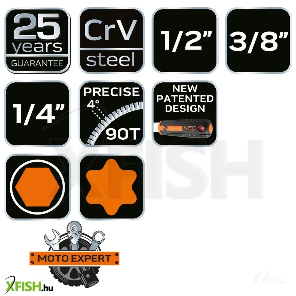 Ez a Neotools szerszámkészlet nem csak a különböző méretű és típusú dugókulcsokat tartalmazza, hanem számos kiegészítő eszközt is, mint például hosszabbítók, csuklók és bittartók, amelyek még sokoldalúbbá teszik a készlet használatát. Az átfogó szerszámkínálat révén a készlet minden otthoni vagy szakmai műhely elengedhetetlen kellékévé válik.