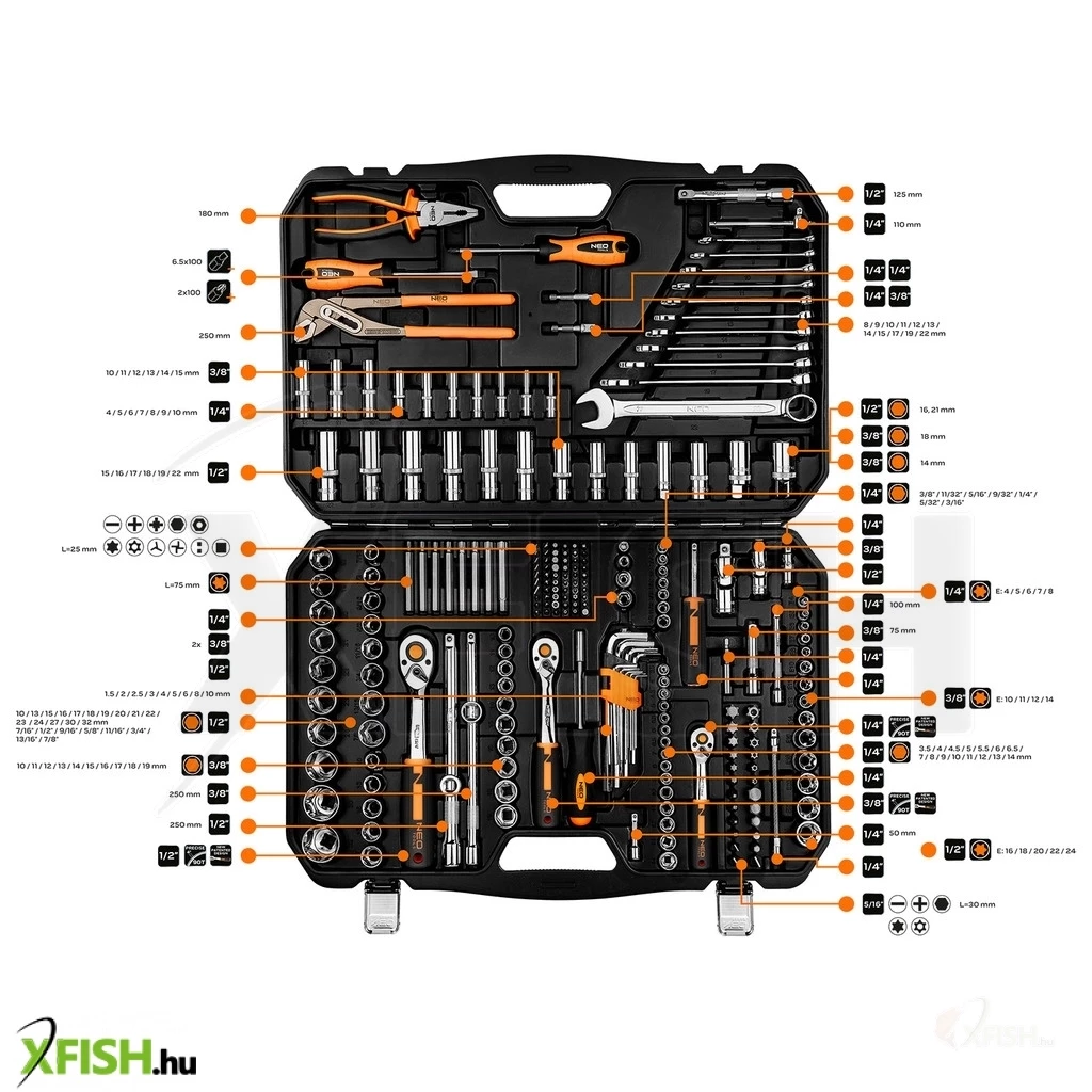 Neotools dugókulcskészlet + szerszámkészlet 1/4, 3/8, 1/2, 233db