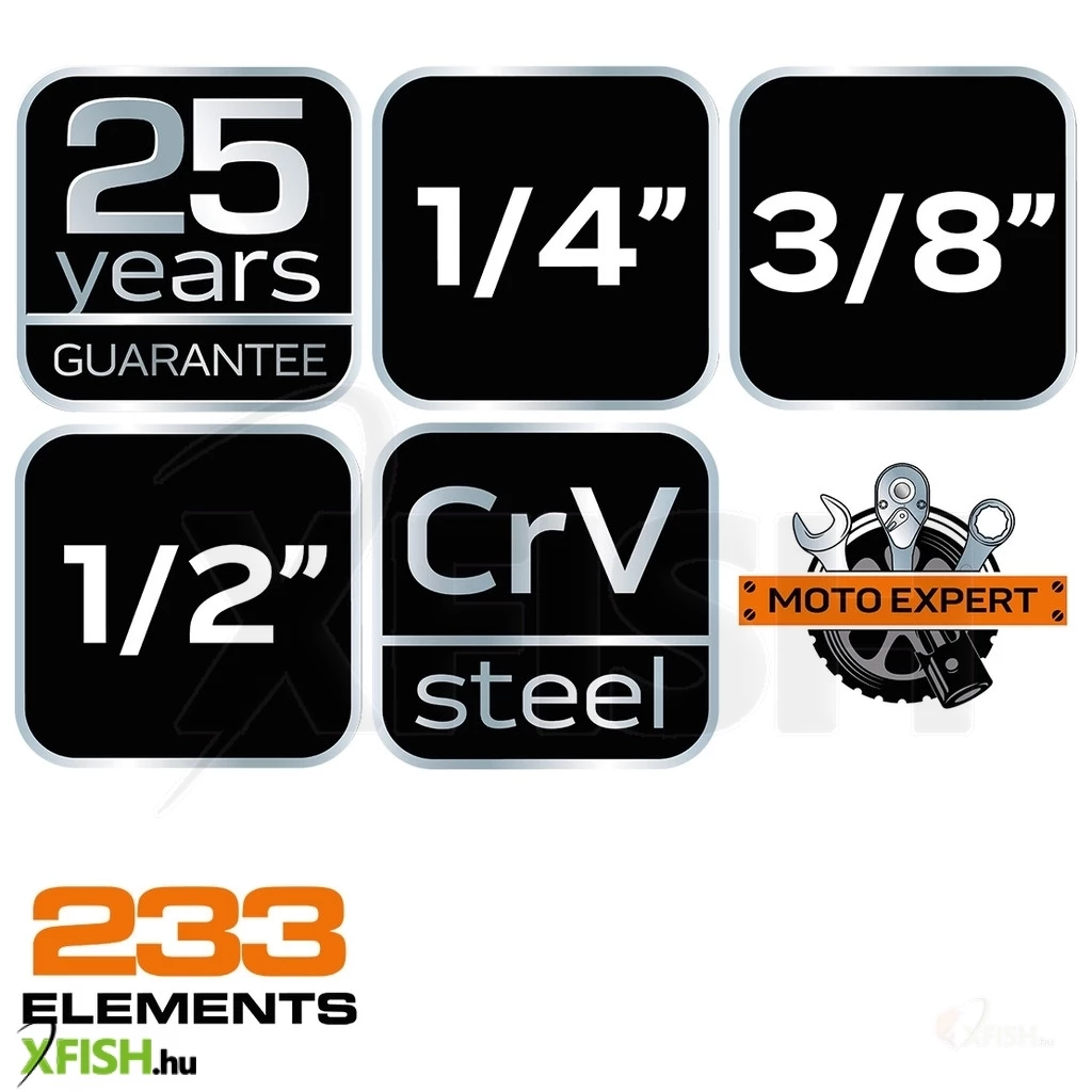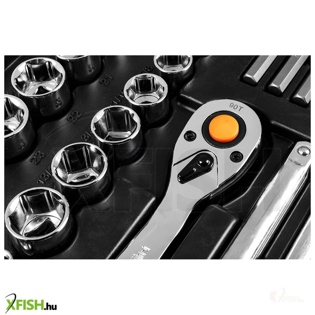 A szerszámkészlet nemcsak dugókulcsokat, hanem számos más praktikus eszközt is tartalmaz, amelyek nélkülözhetetlenek a mindennapi javítási és karbantartási munkák során. Az egyes elemek könnyen megtalálhatók és rendezettek, köszönhetően az átlátható elrendezésnek és a strapabíró, hordozható tárolódoboznak.