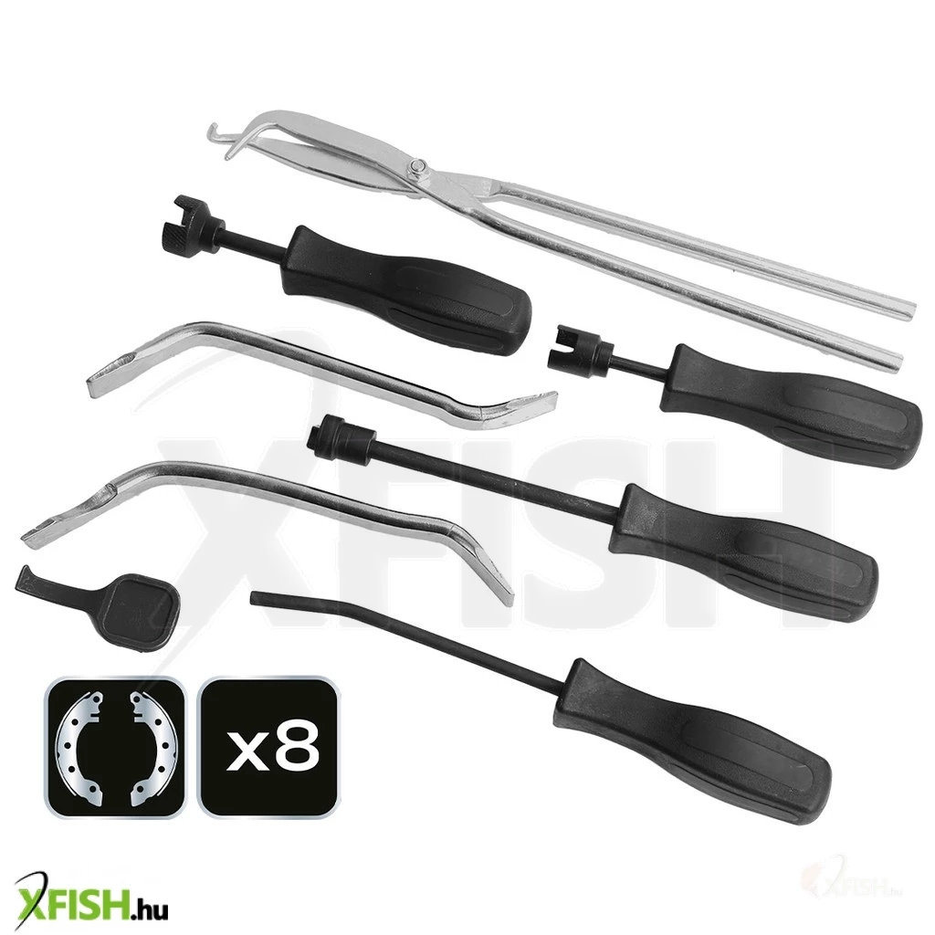 A készlet tartalmazza mindazt, amire szüksége lehet, például fékrugó fogót, két fékpofa eltávolító és beállító kanalat, egy rugó eltávolító eszközt, egy rugó összenyomót, valamint három rugó beszerelőt. Ezek a szerszámok a dobfékek karbantartását jelentősen megkönnyítik, lehetővé téve, hogy bármilyen problémát gyorsan és hatékonyan megoldhasson.