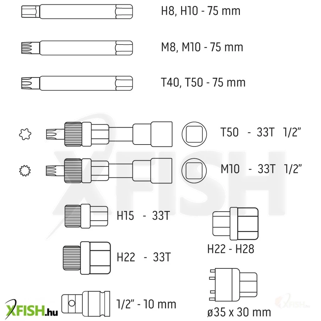 A 13 darabból álló készlet többek között tartalmaz egy 1/2" bit dugókulcsot T50, valamint 33 fogas generátor szíjtárcsa kulccsal (Bosch típusú). Továbbá megtalálható benne egy SPLINE M10 bit is ugyanilyen foglalattal. A különböző formájú és méretű hatszögletű bitek, mint a T40, T50, SPLINE M8 és M10, valamint HEX 8 mm és 10 mm, lehetővé teszik a különféle csavarok és rögzítők eltávolítását vagy meghúzását.