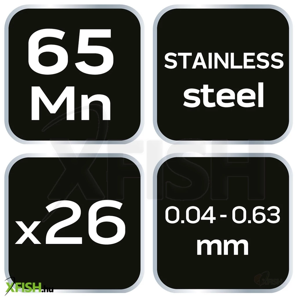 - Anyagok: Rozsdamentes acél, 66MN acél