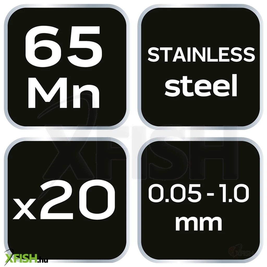 A készlet 65MN acélból készült, mely biztosítja a kiváló tartósságot és megbízhatóságot a mindennapi használat során, míg a rozsdamentes acél ház védi a lapokat a környezeti hatásokkal szemben, így hosszú távon is megőrzi eredeti állapotát. Az egyes elemek kúpos végzárásúak, ami megkönnyíti a használatukat és lehetővé teszi a rendkívül szoros terek mérését.