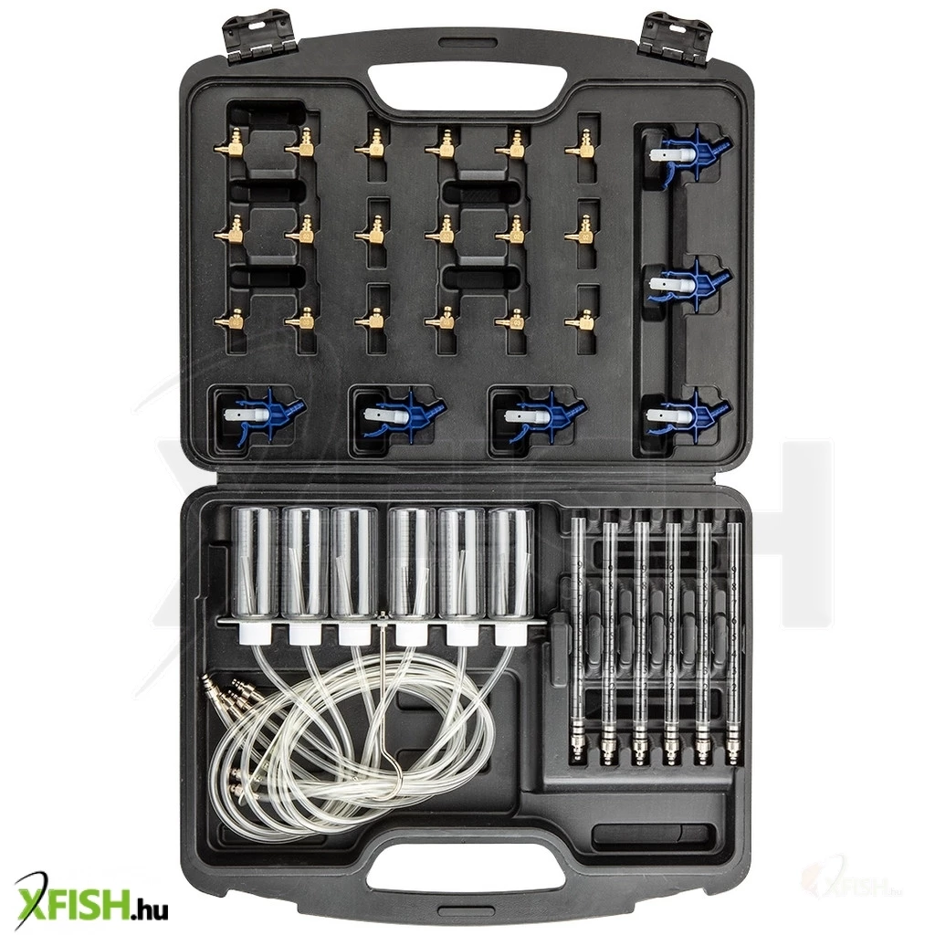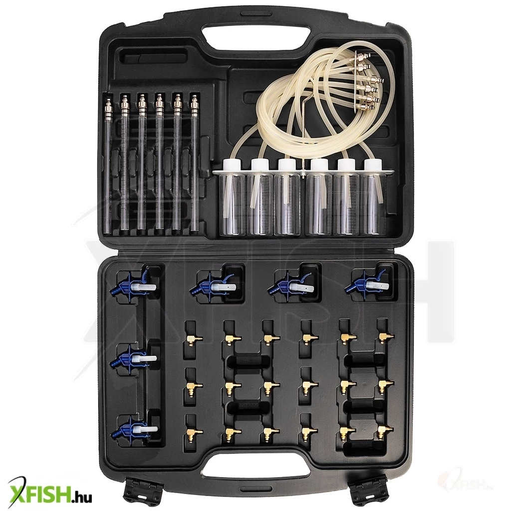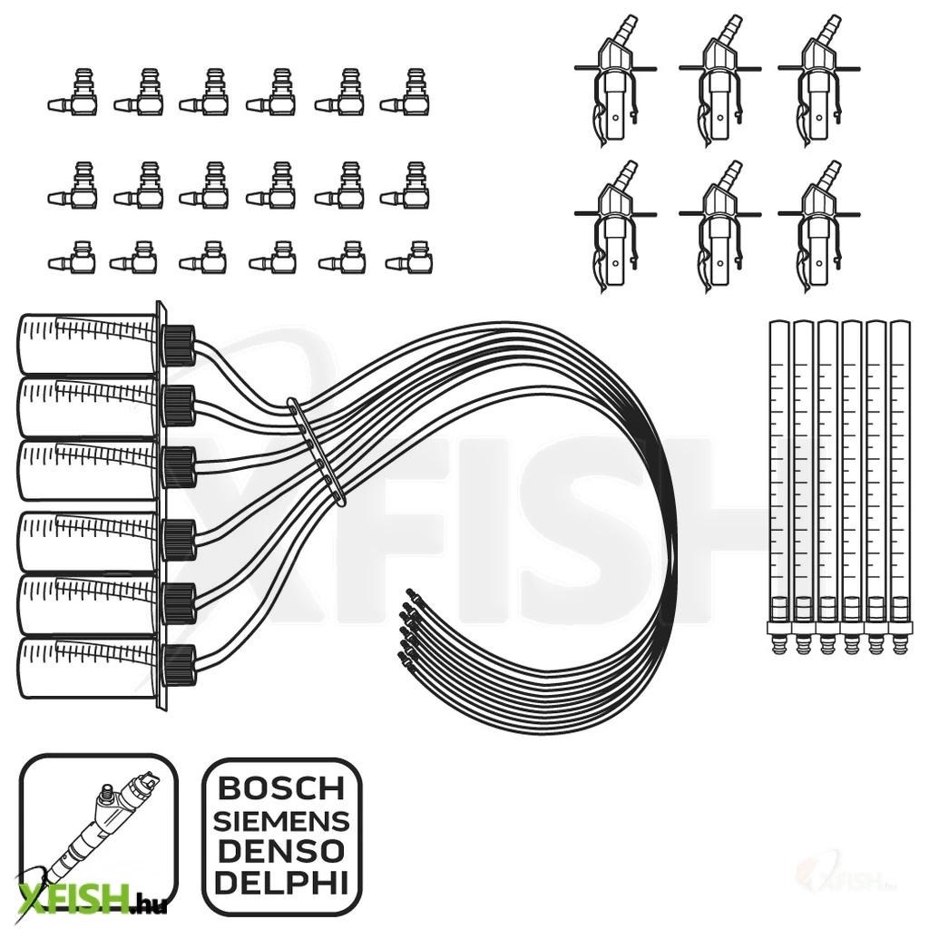 A termék tartalmát tekintve, a készlet hat darab visszafolyási mennyiségmérő poharat, üzemanyagálló, átlátszó tömlőt és manométercsövet tartalmaz, biztosítva a részletes és pontos diagnosztikai munkát. A készlet megbízható működéséhez hozzájárul a hat darab, különféle rendszerű csatlakozó, amelyek a fenti márkák injektoraihoz lettek tervezve, és nyomásálló csövekkel együtt garantálják a biztonságos csatlakoztatást és használatot.