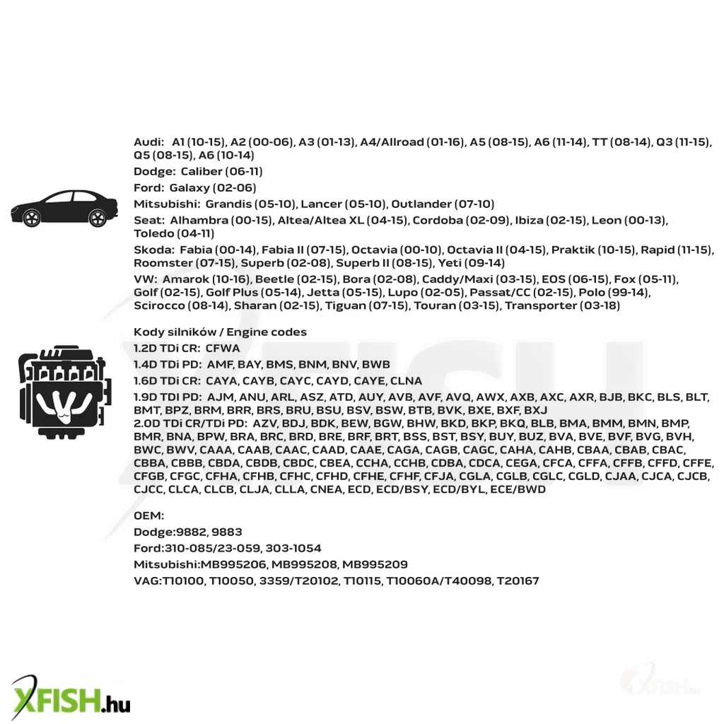 - Motorkódok: 1.2D TDi CR, 1.4D TDi PD, 1.6D TDi CR, 1.9D TDI PD, 2.0D TDi CR/TDi PD