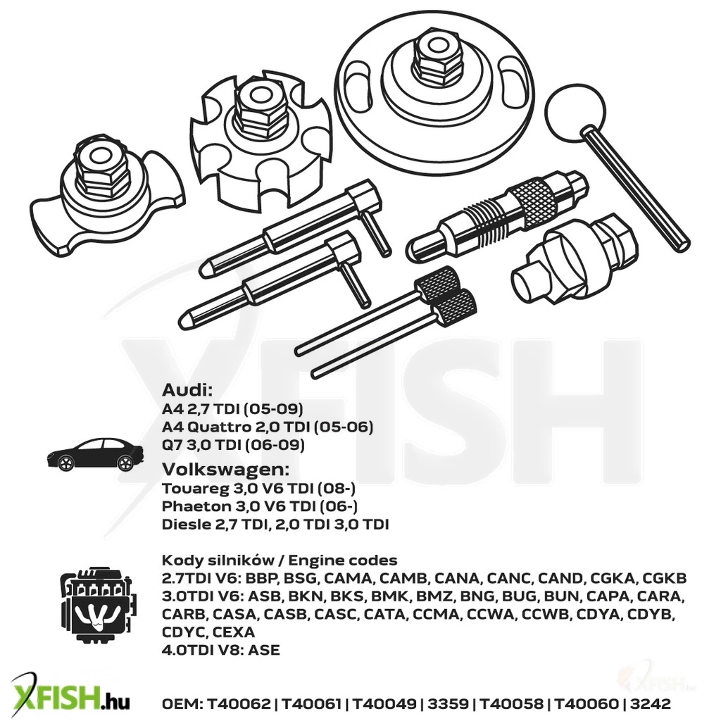 A készlet kompatibilis egy sor motorkódhoz, ilyenek például a 2.7TDI V6 motorok (BBP, BSG, CAMA, CAMB, CANA, CANC, CAND, CGKA, CGKB) és a 3.0TDI V6 motorok (ASB, BKN, BKS, BMK, BMZ, BNG, BUG, BUN, CAPA, CARA, CARB, CASA, CASB, CASC, CATA, CCMA, CCWA, CCWB, CDYA, CDYB, CDYC, CEXA), valamint a 4.0TDI V8-as ASE motorkód. Az OEM kódok (T40062, T40061, T40049, 3359, T40058, T40060, 3243) alapján a szerszám megbízhatóságot és tökéletes illeszkedést garantál.