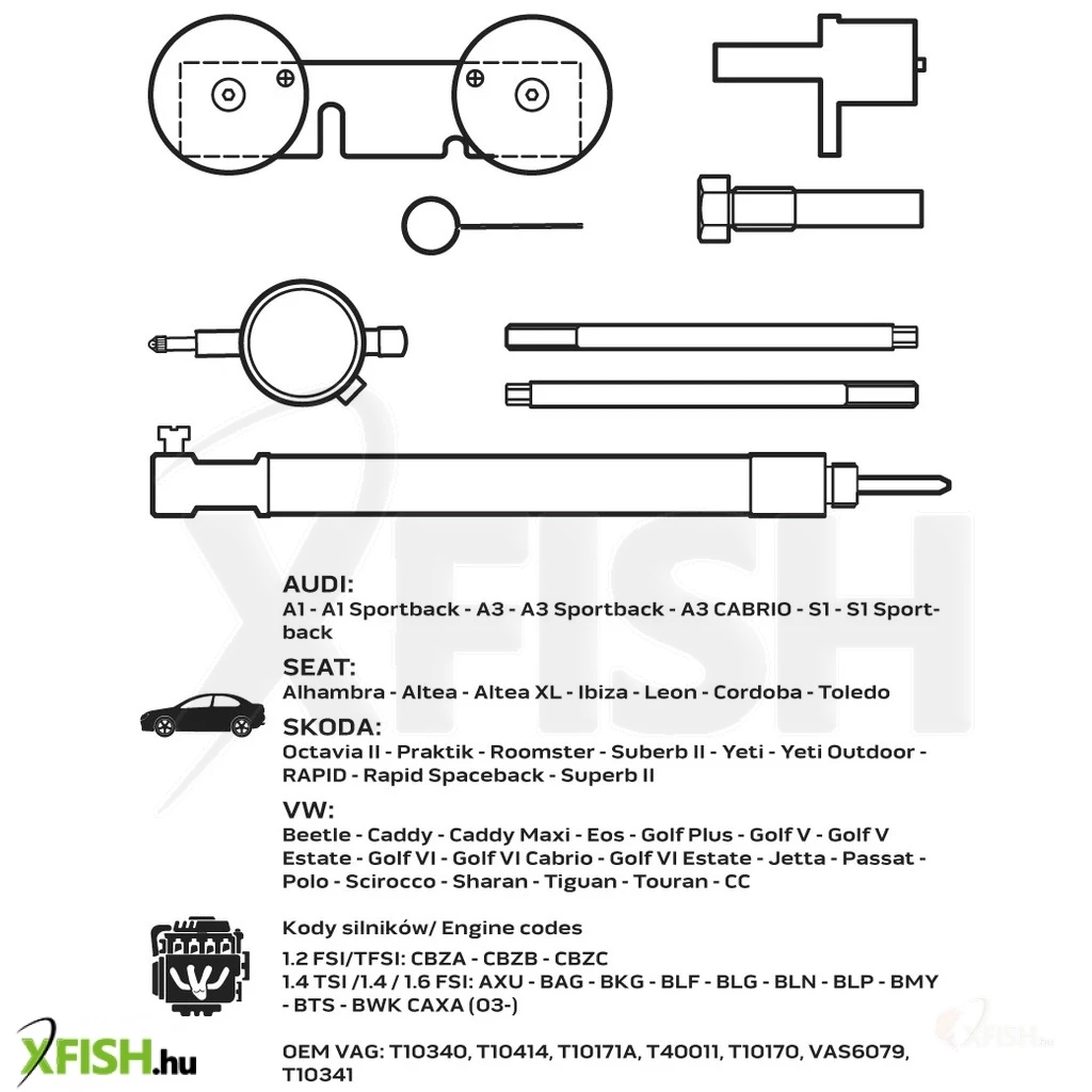 A termék OEM-számok szerint is azonosítható, így könnyedén összeilleszthető a meglévő eszközökkel. Az OEM számok, mint például a T10340, T10414, T10171A, T40011, T10170, VAS6079, T10341, mind részét képezik ennek az univerzális és megbízható készletnek. A szerszámok kényelmesen tárolhatók a mellékelt, kofferbe csomagolt szettben, amely nemcsak védi az eszközöket, hanem lehetővé teszi a könnyű szállítást és szervezést is.