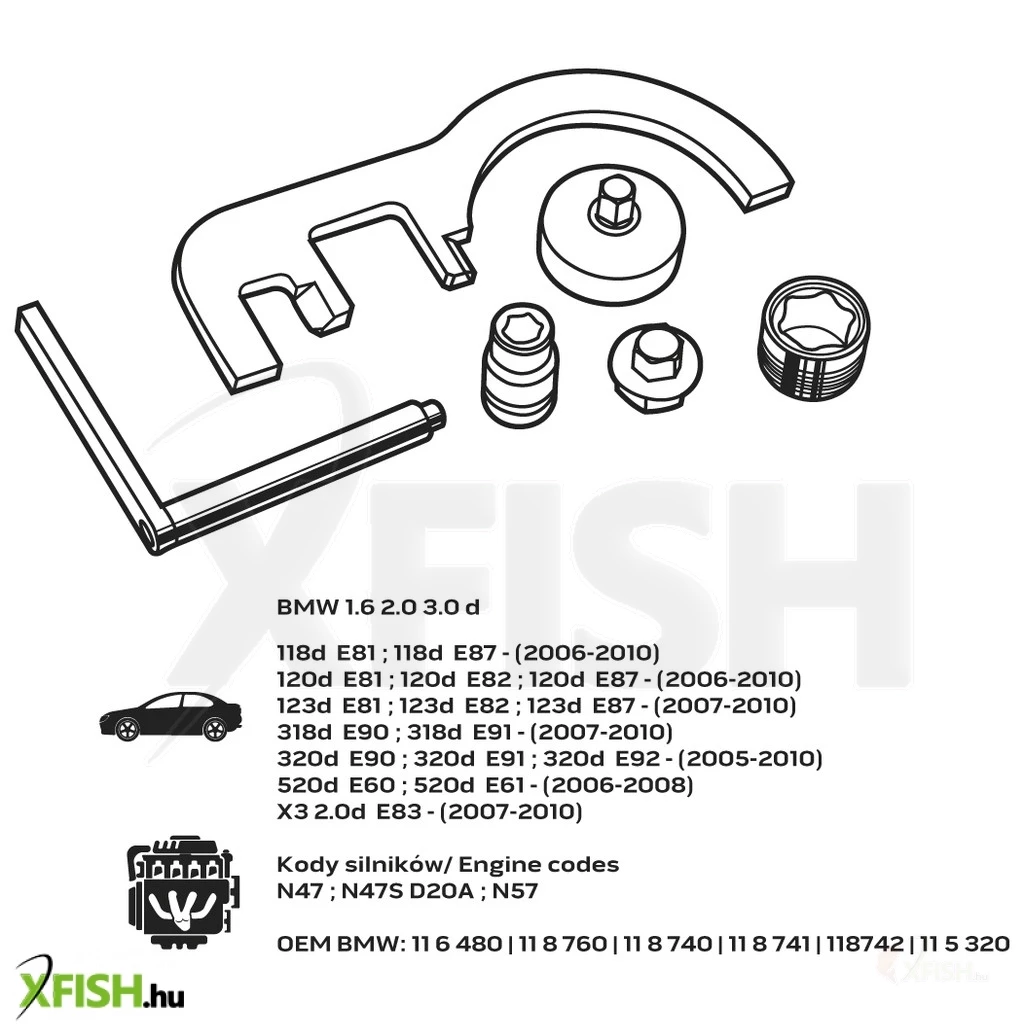 Kompatibilis a következő BMW modellekkel: 118d E81, E87 (2006-2010), 120d E81, E82, E87 (2006-2010), 123d E81, E82, E87 (2007-2010), 318d E90, E91 (2007-2010), 320d E90, E91, E92 (2005-2010), 520d E60, E61 (2006-2008), és az X3 2.0d E83 (2007-2010). Továbbá, megfelel a N47, N47S D20A és N57 motorkódokkal rendelkező modellek speciális igényeinek is. Az OEM BMW számok, amelyekkel az eszköz kompatibilis: 11 6480, 11 8760, 11 8740, 11 8741, 118742, 11 5321. Az eszköz célja, hogy a BMW dízelek karbantartását és szerelését sokkal gördülékenyebbé és hatékonyabbá tegye.