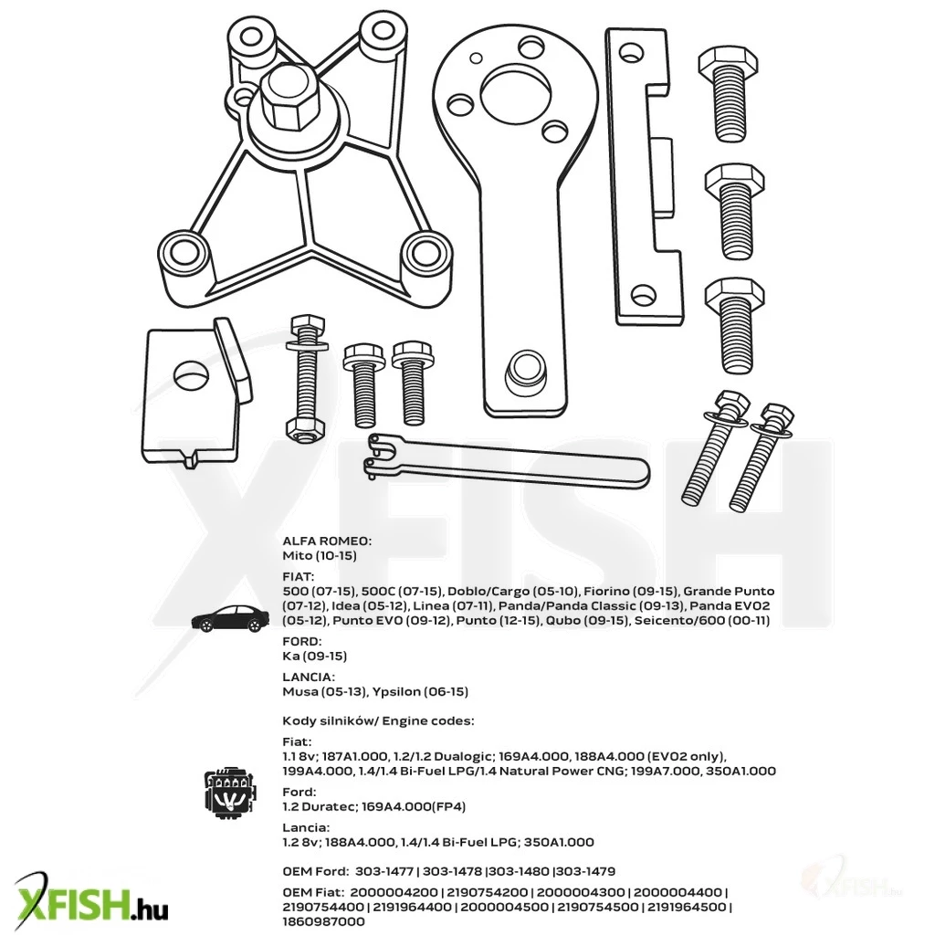 A készlet a legkülönbözőbb motorváltozatokhoz is igazodik, amelyek között megtalálhatóak a Fiat 1.1 8v, 1.2 és 1.4 motorok különböző variánsai, a Ford 1.2 Duratec motorja és a Lancia 1.2 és 1.4 motorjai is. Az eszközök a gyári OEM kódok szerint lettek kialakítva, ezáltal biztosítva a teljes kompatibilitást az adott járművekkel. Az OEM kódok közé tartozik többek között a Fiat 2000004200, 2190754200 és más azonosítók, valamint a Ford 303-1477 és társai. Ezen specifikációk részletezése garantálja, hogy a készletet bizalommal használhatja a kapcsolódó járművek karbantartásához.
