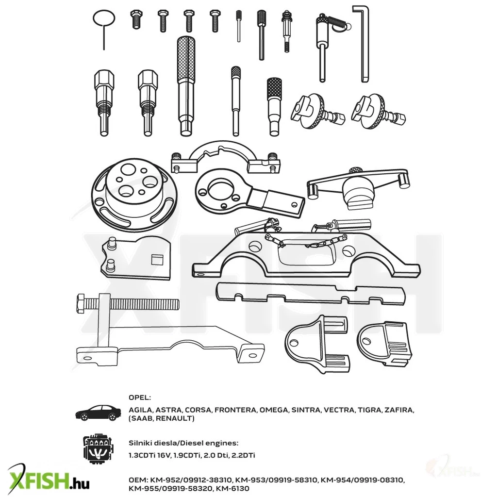 A készlet a következő típusú dízelmotorokkal kompatibilis: 1.3 CDTi 16V, 1.9 CDTi, 2.0 Dti és 2.2 Dti. Ez lehetővé teszi, hogy a leggyakrabban előforduló, korszerű dízelmotor-típusokon is hatékony munkát végezhessenek vele. Az eszköz OEM kódokkal rendelkezik: KM-952/09912-38310, KM-953/09919-58310, KM-954/09919-08310, KM-955/09919-58320, KM-6131, amelyek garanciát jelentenek a minőségre és a pontosságra a munkafolyamatok során.