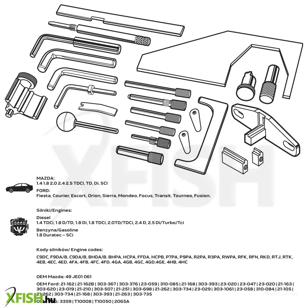 Az autó-kompatibilitás tekintetében széles körben alkalmazható, így nemcsak a Mazda, hanem számos Ford modellnél is hasznos lehet – beleértve a Fiesta, Mondeo, Focus, és más ismert típusokat. A motorok kódjai, mint például a C9DC, F9DA/B, és számos más konfiguráció, mind megtalálható a kompatibilitási listán, megkönnyítve a megfelelő eszköz beazonosítását az adott járműhöz. Az OEM (Original Equipment Manufacturer) azonosítók részletessége pedig biztosítja, hogy ez a készlet könnyen beilleszthető a meglévő szervizszerszámok közé.