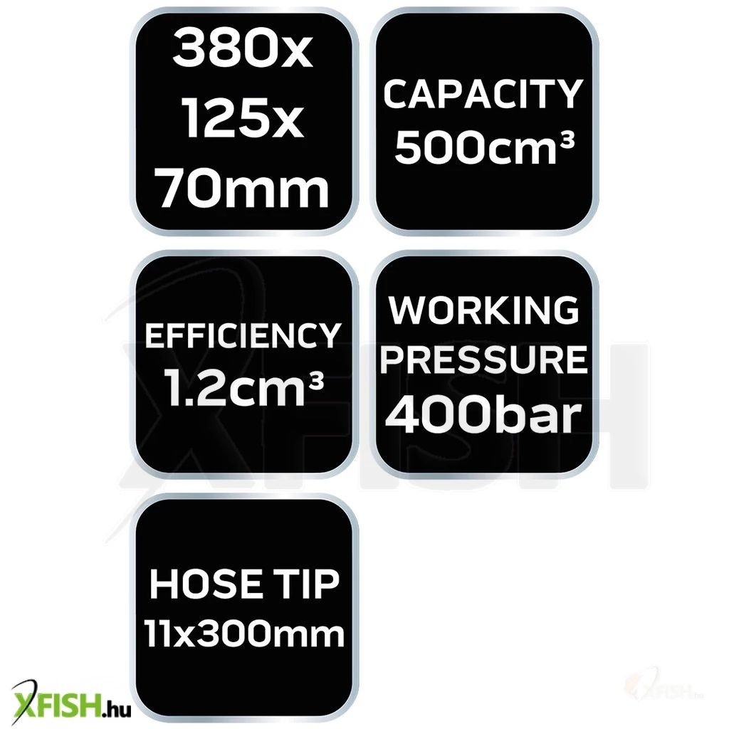 A zsírzópisztoly 500 cm3 űrtartalmú, és egy 11 x 300 mm-es, rugalmas tömlővel van ellátva, amely lehetővé teszi a nehezen elérhető helyek könnyű megközelítését. Az eszköz 4 pofás hegye precíziós munkát tesz lehetővé, míg a 1,2 cm3 kapacitás karlépésenként hatékony és gyors kenést biztosít. A kenőgép hengerfalának 1 mm-es vastagsága és a 400 bar üzemi nyomás biztosítja, hogy a szerszám hosszú élettartamú, valamint nagy kenési kapacitású legyen.