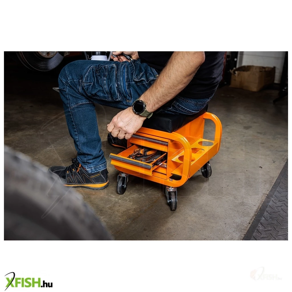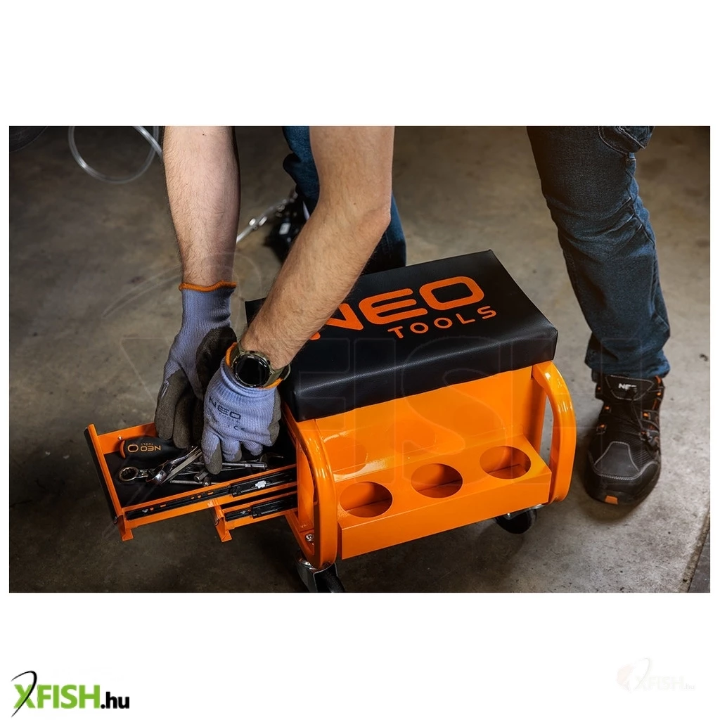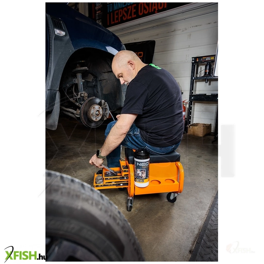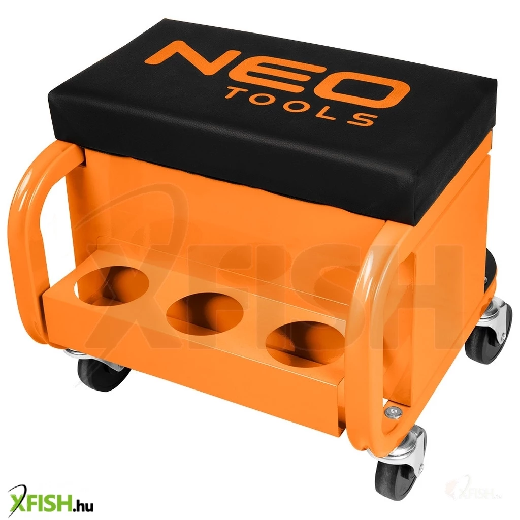 Neotools szerelőszék, fém szerkezetű, kerekekkel, szerszámfiókokkal