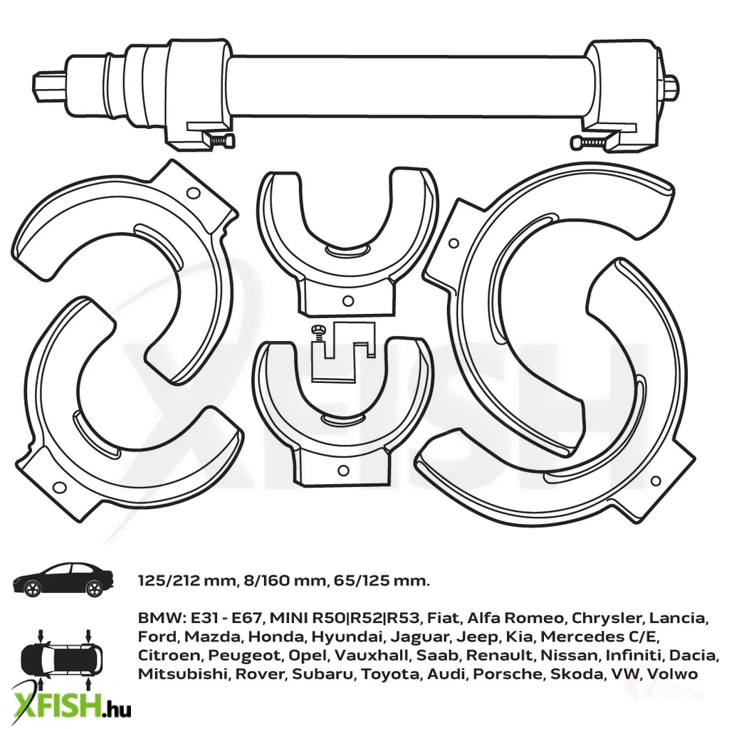 A Neotools rugóösszehúzó készlet kifejezetten olyan márkák és modellek széles skálájához illeszkedik, mint a BMW E31 – E67, MINI R50 | R52 | R53, Fiat, Alfa Romeo, Chrysler, Lancia, Ford, Mazda, Honda, Hyundai, Jaguar, Jeep, Kia, Mercedes C / E, Citroen, Peugeot, Opel, Vauxhall, Saab, Renault, Nissan, Infiniti, Dacia, Mitsubishi, Rover, Subaru, Toyota, Audi, Porsche, Skoda, VW, és Volvo. Kialakítása lehetővé teszi, hogy kúpos rugókhoz is alkalmazható legyen, ami még inkább növeli a termék rugalmasságát a különböző javítási munkák során.