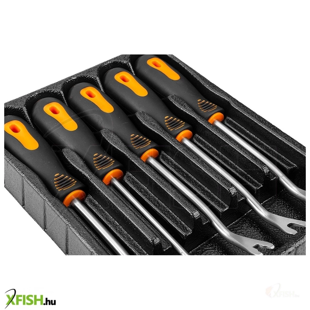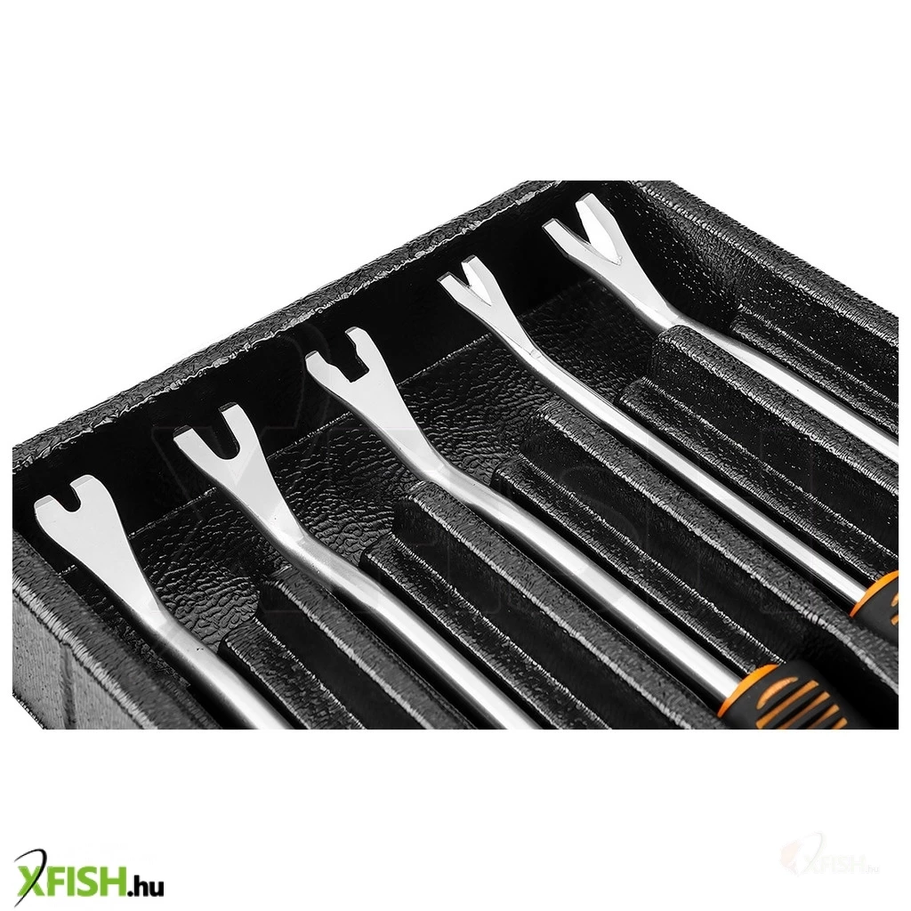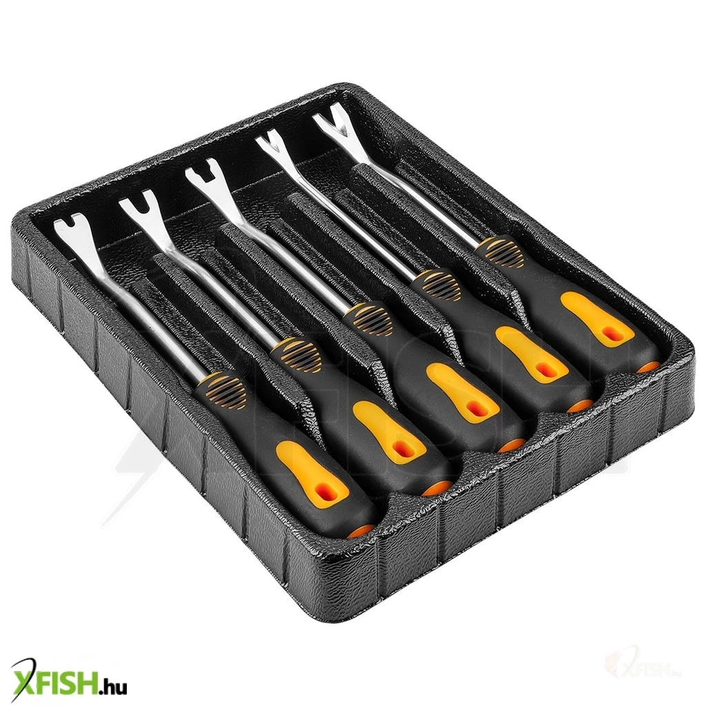 A készlet öt különböző kárpitpatent kiszedőt tartalmaz, melyek kompatibilisek a különböző alakú patentekkel. Az eszközök ergonomikus kialakítású nyele biztosítja a kényelmes fogást, így hosszabb ideig dolgozhatunk vele anélkül, hogy fáradnánk. A fém alapanyagú kiszedők tartósságukkal garantálják a hosszú távú használatot, ezért ez a készlet kiváló befektetés minden autószerelő számára.
