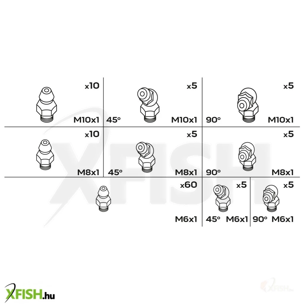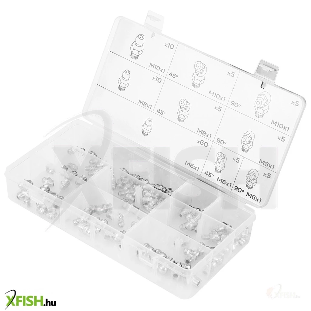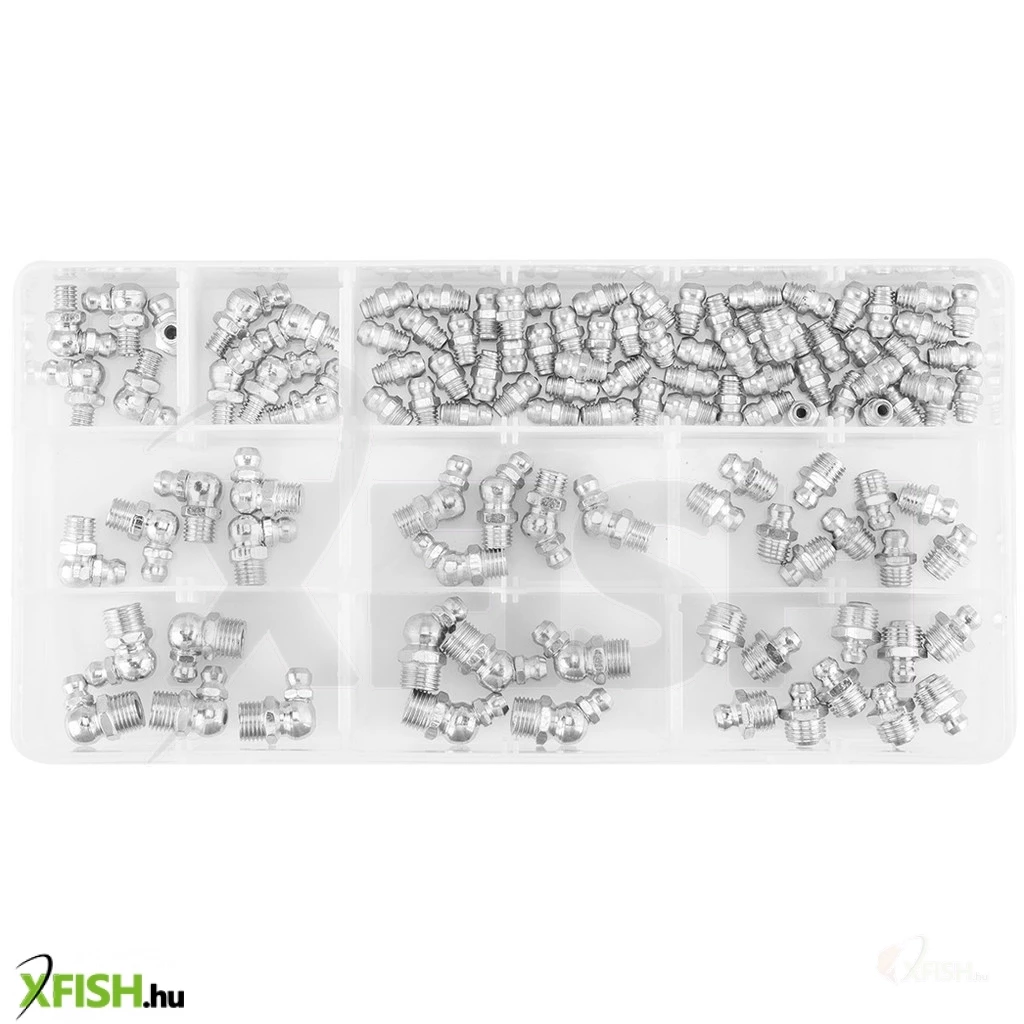 A zsírzógombok a kenési folyamatok kulcsfontosságú eszközei, ahol a megfelelő kenőanyag mennyisége és elosztása létfontosságú a hosszú élettartam és a megbízható működés érdekében. A készlet különböző méreteket és szögeket biztosít: hatvan darab M6x1-es zsírzógomb mellett találunk öt darab 45 fokos és öt darab 90 fokos változatot is ebben a méretben. Továbbá tíz darab M8x1-es zsírzógomb, valamint öt-öt darab 45 és 90 fokos szögű M8-as darabok, továbbá tíz darab M10x1-es és öt-öt darab ugyanezen méretű 45 és 90 fokos zsírzógomb is a készlet részét képezi.