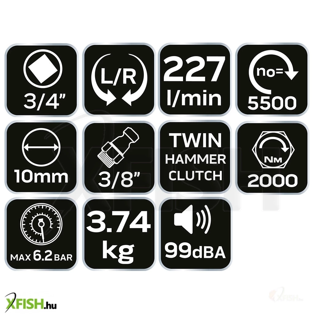 Az eszköz három különböző forgatónyomaték-beállítási lehetőséget kínál, amelyek kezdőértékei 1160 Nm-től indulnak és a maximális teljesítményt jelentő 2000 Nm-ig terjednek, így biztosítva a felhasználó számára a rugalmasságot és a teljes ellenőrzést minden munkafázis során. Üzemi nyomása 6,3 - 7,0 bar között mozog, míg átlagos levegőigénye 227 l/perc, ami garantálja a hatékony működést különböző kompresszorrendszerekkel is. Az eszköz robosztus, CE tanúsítvánnyal ellátott kialakítása fokozza a megbízhatóságot, így bármilyen kihívásnak ellenáll.