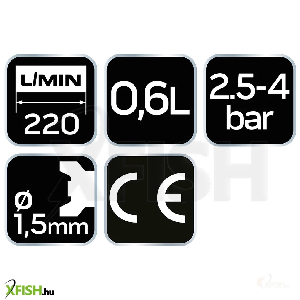 A festékszóró egy 0,6 literes műanyag felső tartállyal van ellátva, amely könnyű, ám erős szerkezetének köszönhetően hosszú távon is kényelmes és megbízható használatot biztosít. Az eszköz üzemi nyomása 4 bar, amely lehetővé teszi a hatékony festékszórást még magasabb igényeket támasztó alkalmazásokban is. A termék megfelel az európai biztonsági szabványoknak, amelyet a CE tanúsítvány is igazol, így biztos lehet benne, hogy használata biztonságos és szabványos.