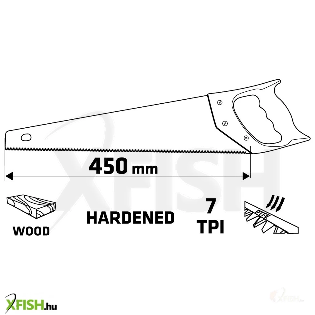 Rókafarkfűrész, 450 mm, PTFE bevonat, 7 TPI, háromélű, edzett fogak, tok, bimateriál markolat.