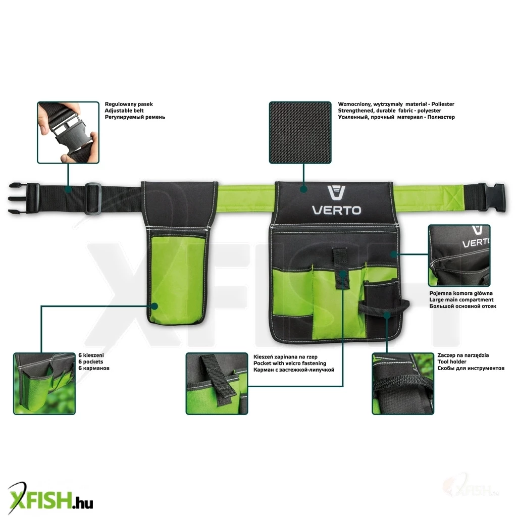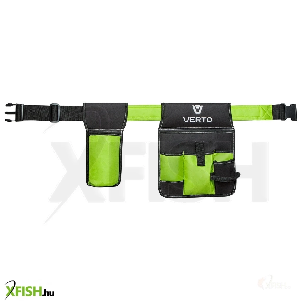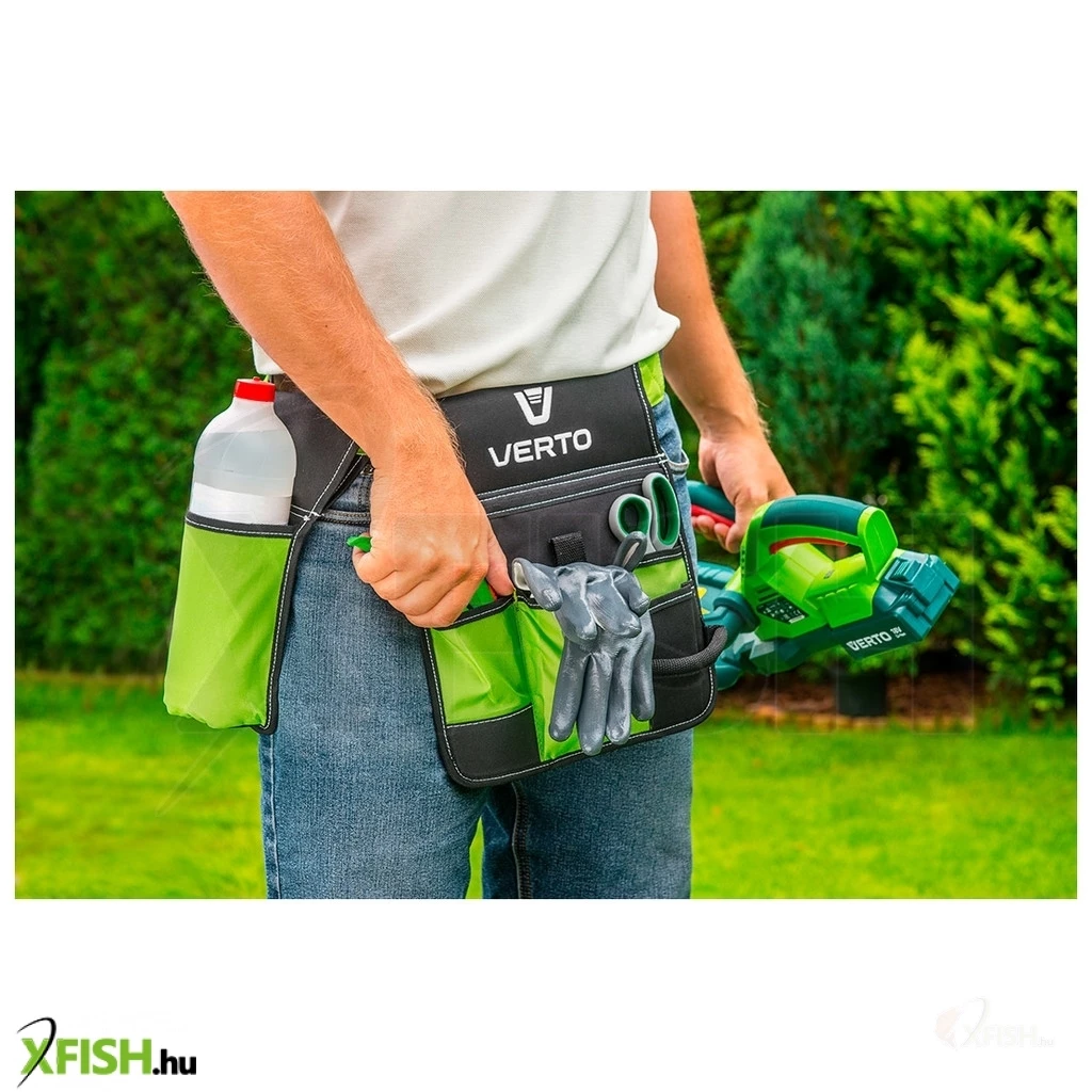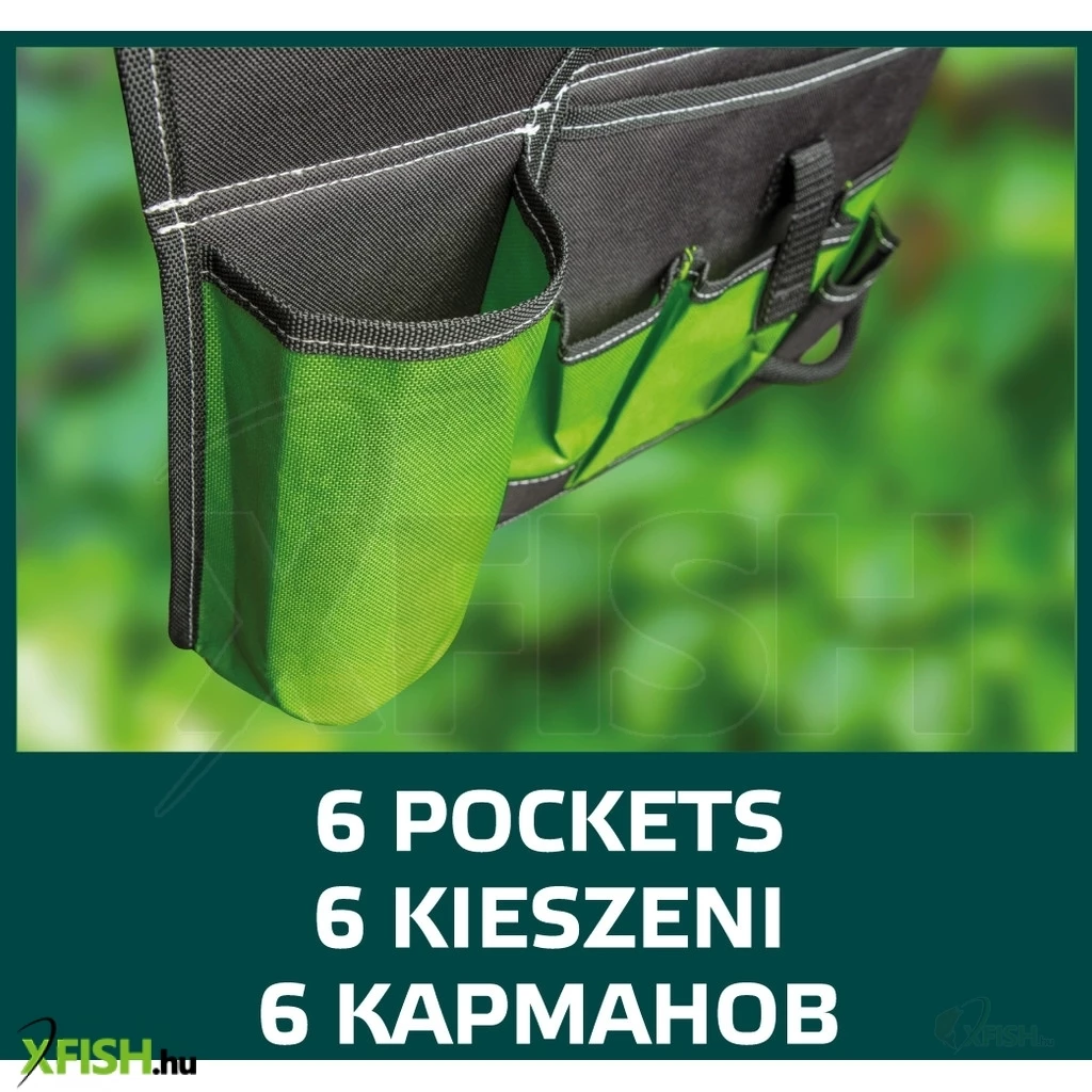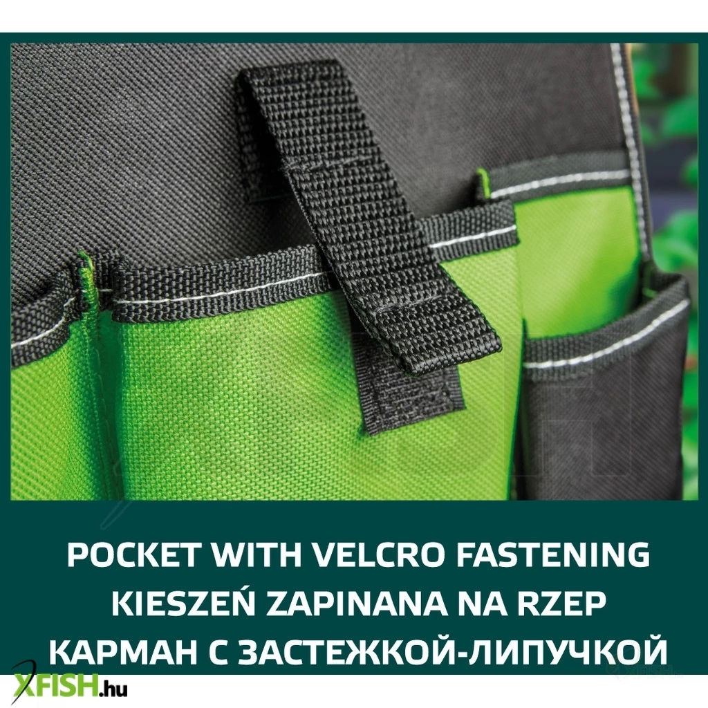 Kerti szerszám tartó öv, 6 külső zseb, szerszám befogófül, poliészter anyagú, az állítható öv maximális kerülete 118cm.