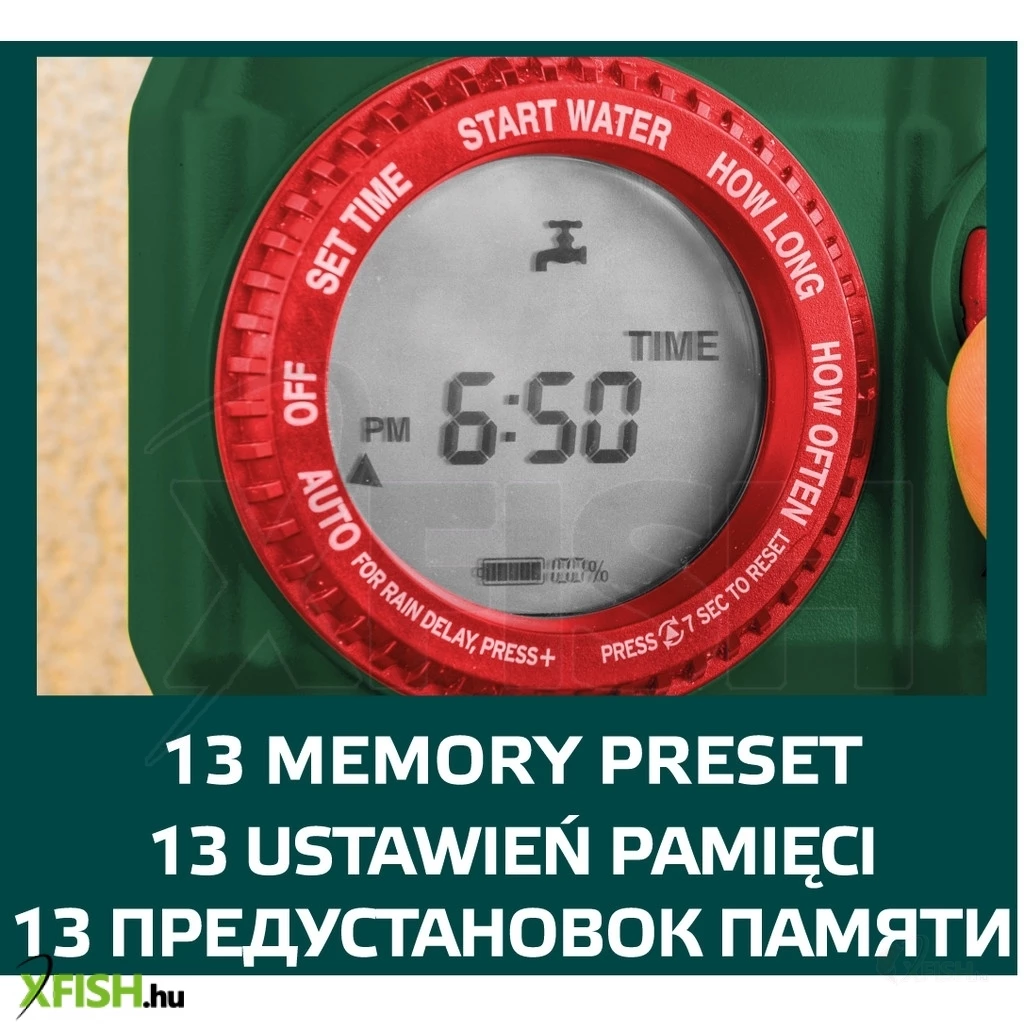 Elektronikus időzítő kapcsoló, terjedelme 360 perc, 4-funkciós indító kapcsoló, 13 programozható működtető frekvencia, akkumulátor feltöltés kijelző