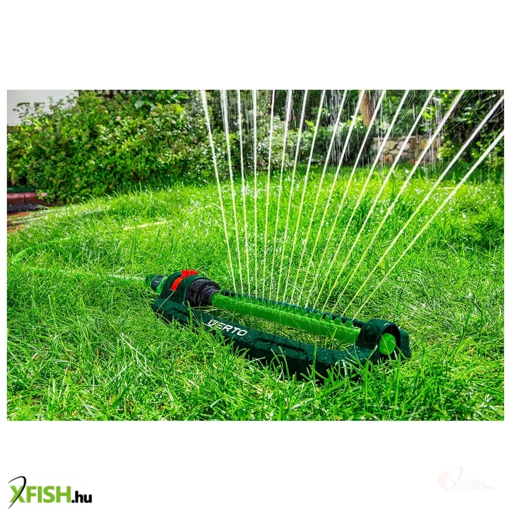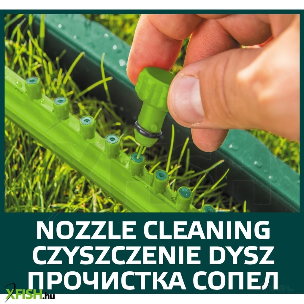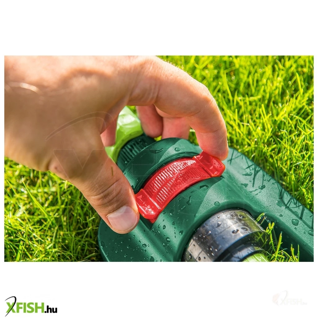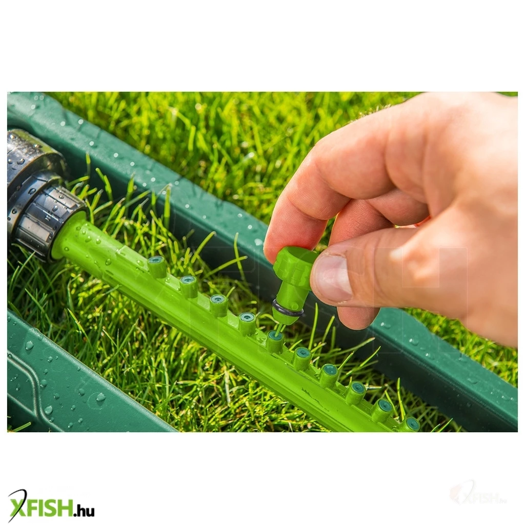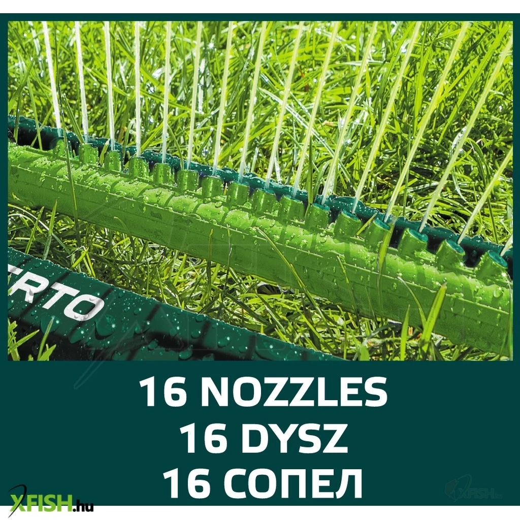 Billenő öntöző, öntözött felület max. 216 m2, 16 öntöző fúvóka, könnyen szabályozható öntözési terjedelem, fúvóka eltömődését elhárító tű, sérülésekkel szemben ellenálló műanyag