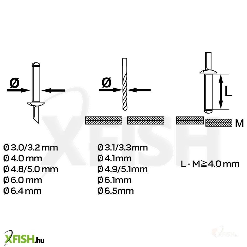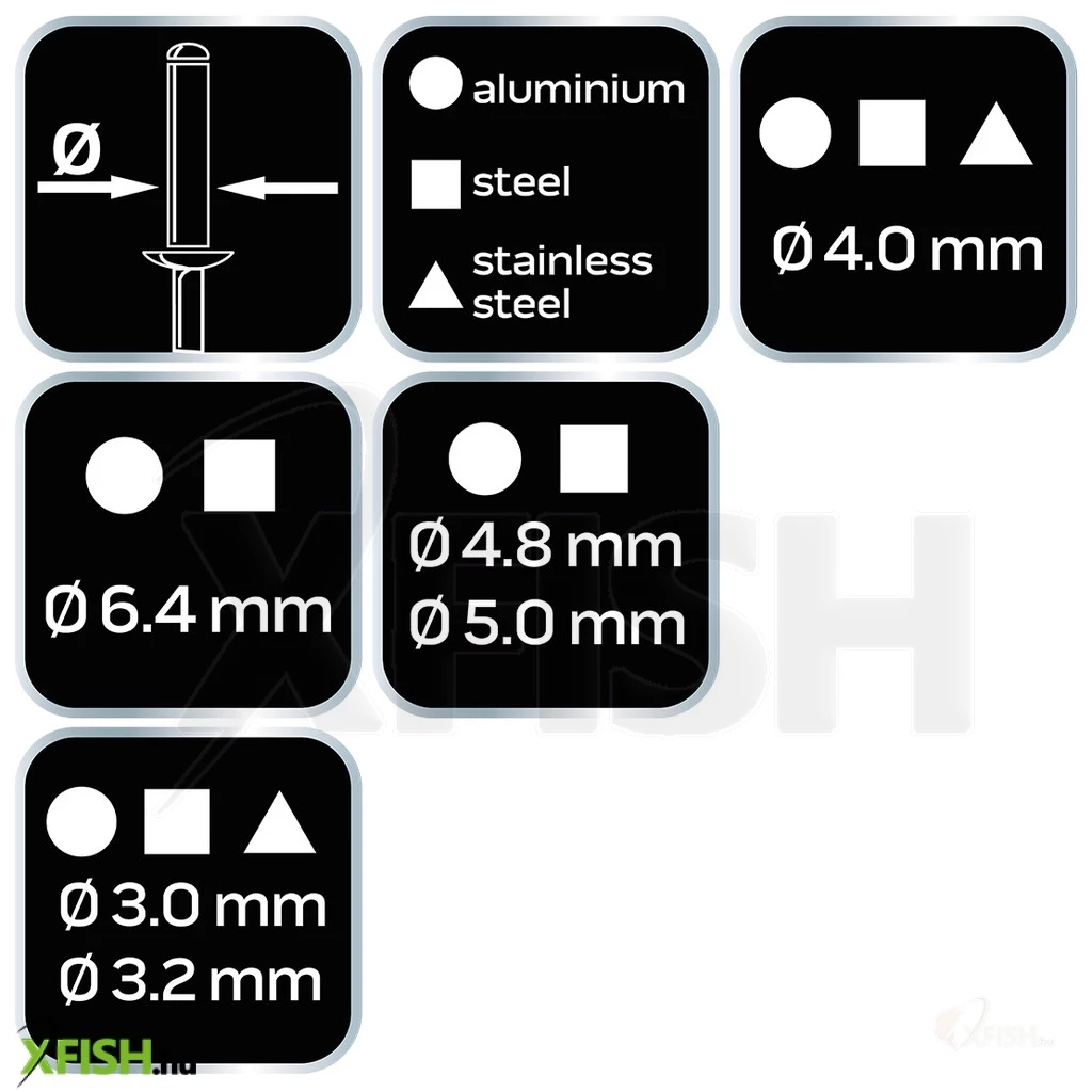 - Szegecsméretek: 3.2 mm - 6.4 mm