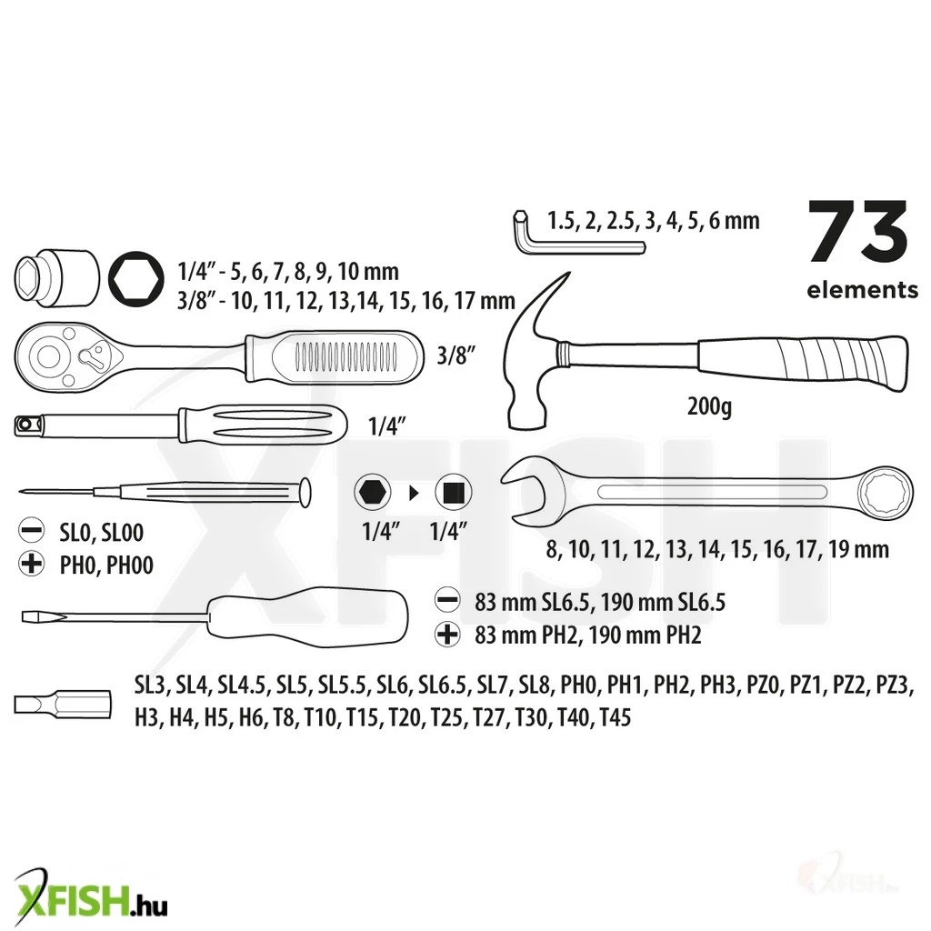Szerszámkészlet 1/4", 3/8", 73 db. Anyaga – szénacél. Racsnis hajtókar 3/8", 39 fogas, behajtó szár 1/4", bittartó 1/4", asztalos kalapács 200g, műszerész csavarhúzók 4 db : PH00, PH0, SL00, SL0, csavarhúzó 190 mm, 2 db: PH2, SL6.5, csavarhúzó 100 mm 2 db: PH2, SL6.5, csillag-villáskulcsok 10 db: 10, 11, 12, 13, 14, 15, 16, 17, 19 mm, HEX kulcsok 1/4", 7 db: 6, 1.5, 2, 2.5, 3, 4, 5, 6 mm, dugókulcsok 3/8" 8 db: 10, 11, 12, 13, 14, 15, 16, 17 mm, dugókulcsok 1/4", 6 db: 5, 6, 7, 8, 9, 10 mm, bithegyek 25 mm: SL3, SL4, SL4.5, SL5, SL5.5, SL6, SL6.5, SL7, SL8, H3, H4, H5, H6, PH0, PH1, PH2, PH3, PZ0, PZ1, PZ2, PZ3, T8, T10, T15, T20, T25, T27, T30, T40, T45.