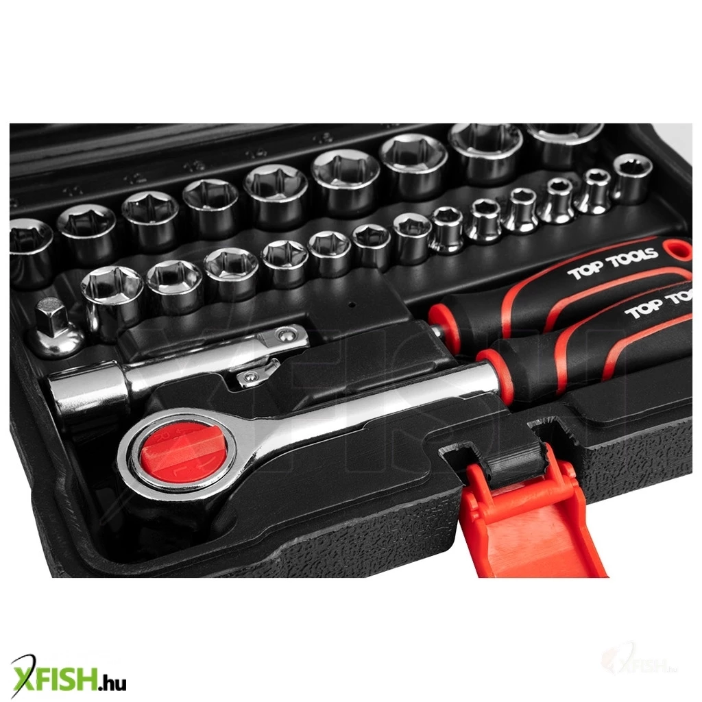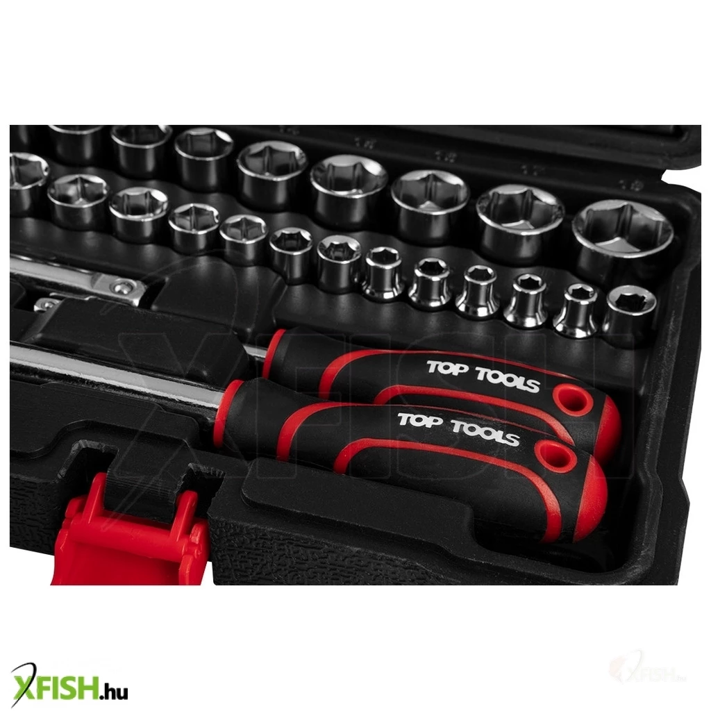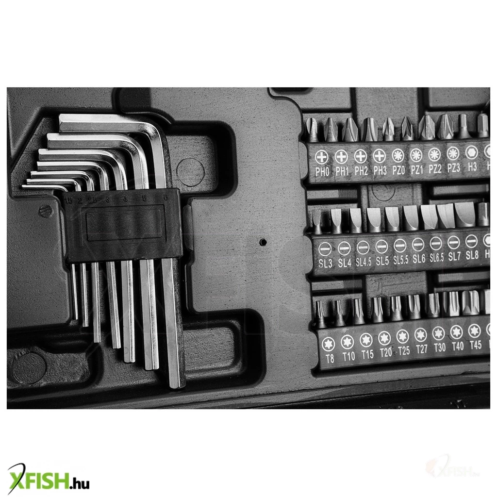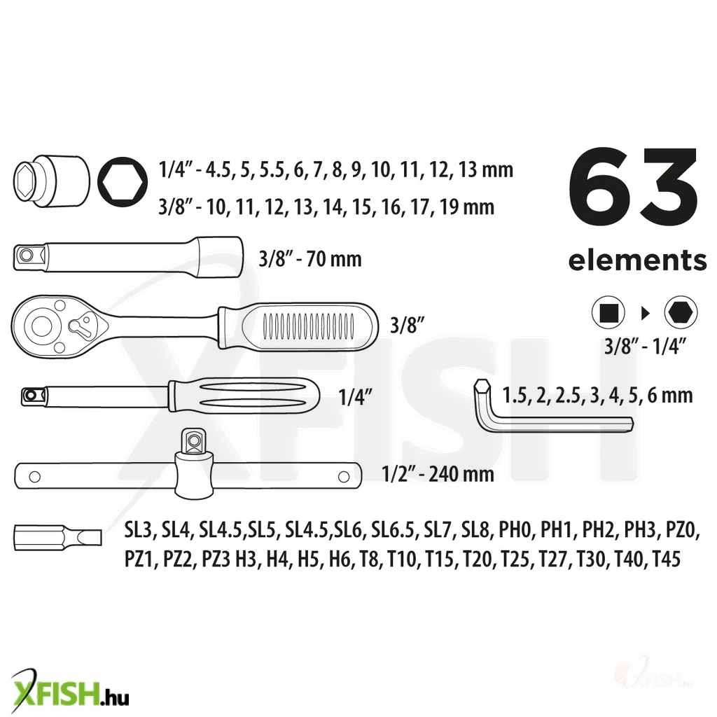 Dugókulcs klt., 3/8", 63 db-os, 3/8" racsnis négylapú hajtókar, 1/4" négylapú hajtókar, 3/8" 70 mm hosszabbító, 3/8"x1/4" szűkítő, bit adapter, imbuszkulcs 1.5mm, 2mm, 2,5mm, 3mm, 4mm, 5mm, 6mm, hatlapú 3/8" dugókulcs, méretek: 10 mm, 11 mm, 12 mm, 13 mm, 14 mm, 15 mm, 16 mm, 17 mm, 19 mm, hatlapú 1/4" dugókulcs, méretek: 4 mm, 4,5 mm, 5 mm, 5,5 mm, 6 mm, 7 mm, 8 mm, 9 mm, 10 mm, 12 mm, 13 mm, csavarozó bit, méretek: T8, T10, T15, T20, T25, T27, T30, T40, T45, H6, SL3, SL4, SL4.5, SL5, SL5.5, SL6, SL6.5, SL7, SL8, H5, PH0, PH1, PH2, PH3, PZ0, PZ1, PZ2, PZ3, H3, H4, hordtáska