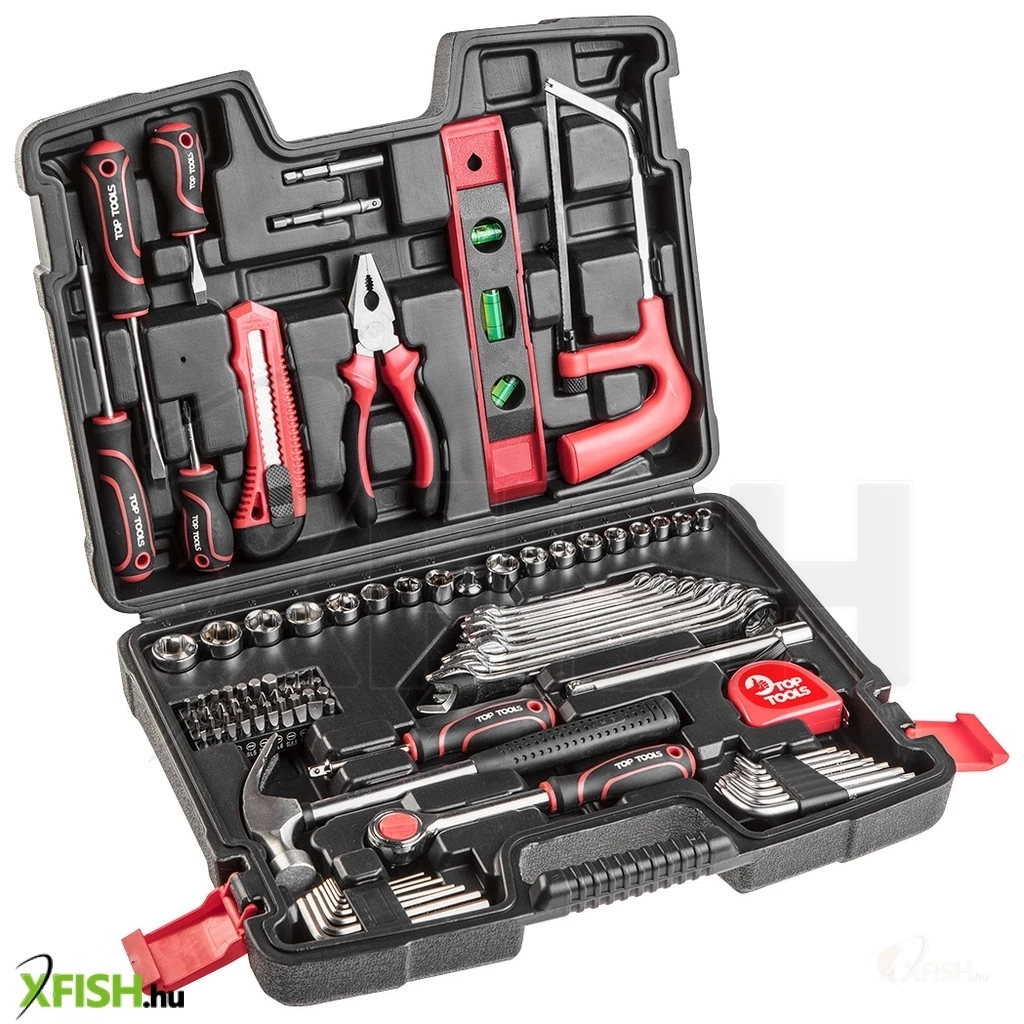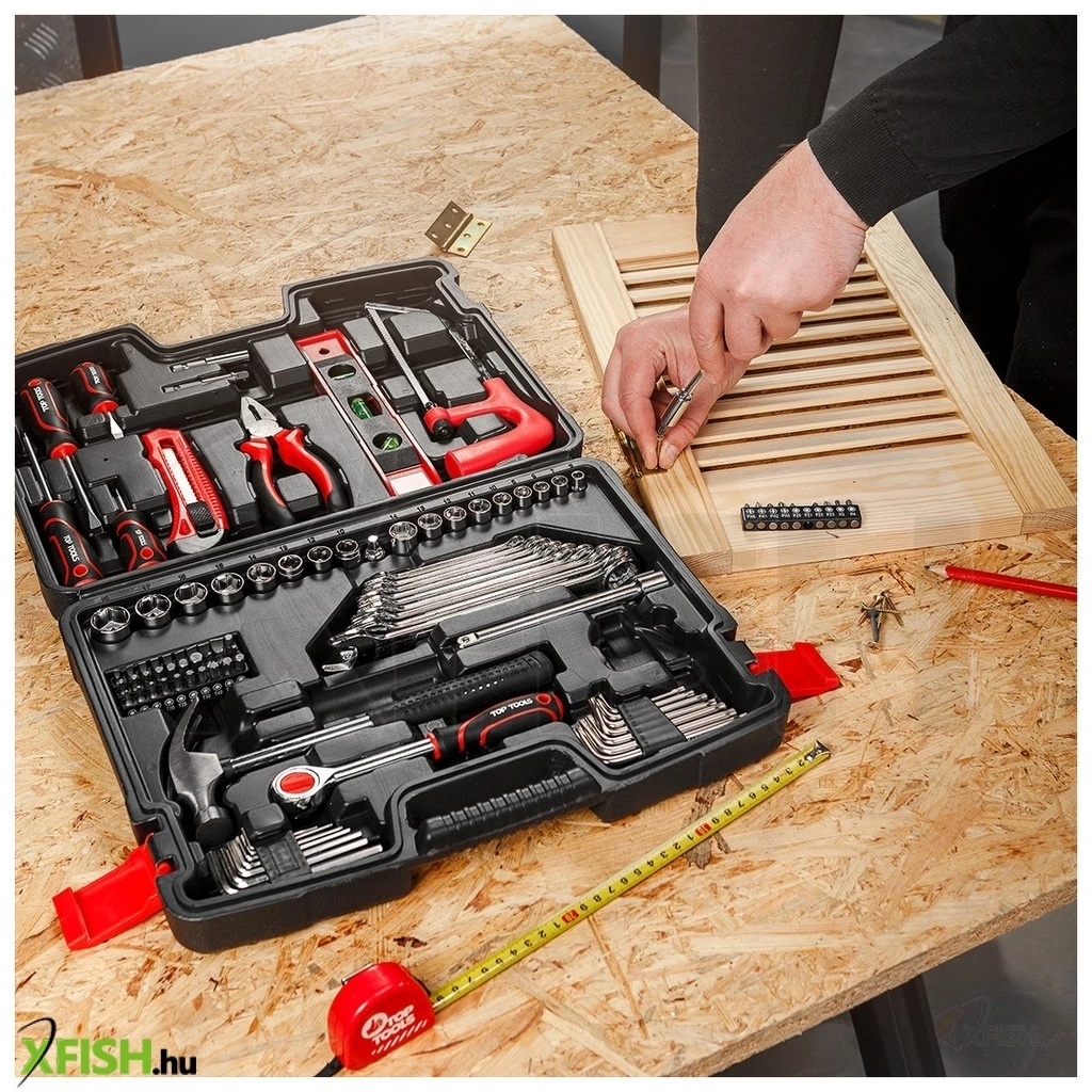 Szerszámkészlet készlet 1/4", 3/8", 100 db.: fémfűrész 150 mm, pótfűrész a fémfűrészhez, kalapács, univerzális fogó 160mm, ratchet 3/8 új TOPTOOLS fogantyú, foglalat 3/8: 10mm, 12mm, 13mm, 14mm, 15mm, 16mm, 17mm, 19mm, extender 3/8 150mm, Fogantyú 1/4, Adapter 3 / 8x1 / 4, foglalat 1/4: 6mm, 7mm, 8mm, 9mm, 10mm, 11mm, 12mm, 13mm, 14mm, Kés 18 mm vastag szélesség, hex kulcs tartóval 1,5mm, 2mm, 2,5mm, 3mm, 4mm, 5mm, 6mm, Torx hex kulcs T10, T15, T20, T25, T27, T30, T40 tartóval, kombinált kulcsok: 8mm, 10mm, 11mm, 12mm, 13mm, 14mm, 16mm, 17mm, 19mm, Csavarhúzó PH2 190mm, Csavarhúzó SL6.5mm 190mm, Csavarhúzó 83mm PH2, Csavarhúzó 83mm SL6.5, Adapter a bithez, Adapter a foglalathoz, mérőszalag, sprit szint, bit, SL3, SL4, SL4,5, SL5, SL5,5, SL6, SL6,5, SL7, SL8, PH0, PH1 PH2, PH3PZ0, PZ1, PZ2, PZ3, H1,5, H2, H2,5, H3, H4 , H5, H6, H1 / 8, H9 / 64, H5 / 32, H3 / 16 H7 / 32 H1 / 4 H5 / 16 T8 T10 T15 T20 T25 T27 T30 T40 T45.