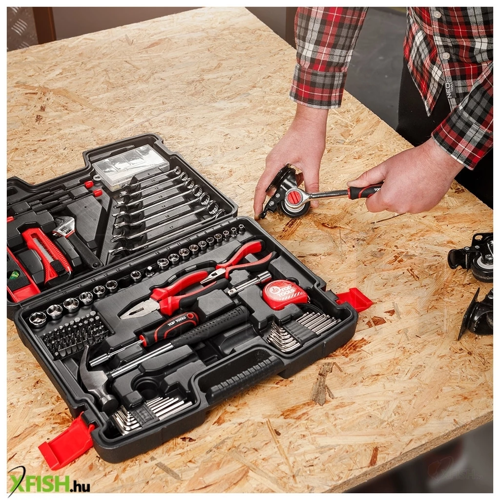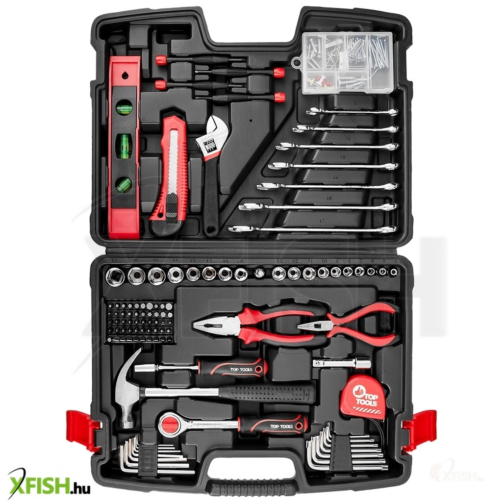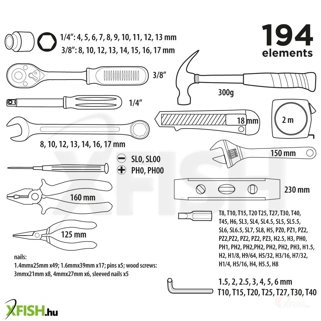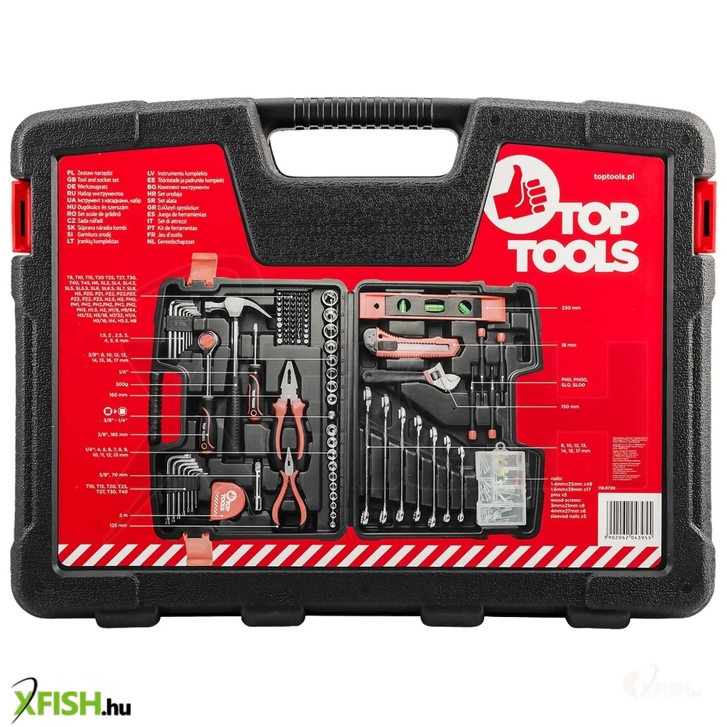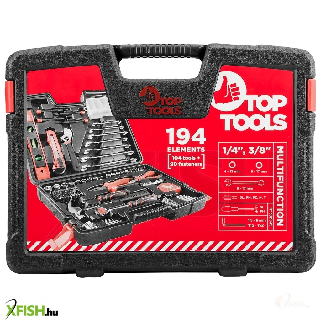 Szerszámkészlet (ref. 38D545) 1/4 ", 3/8" felső szerszámok. Anyag: szénacél. A készlet tartalmaz: 8, 10, 12, 13, 14, 16, 17 mm lapos gyűrűs kulcsokat, Bitek: T8, T10, T15, T20 T25, T27, T30, T40, T45, H6, SL3, SL4, SL4,5, SL5, SL5,5, SL6, SL6,5, SL7, SL8, H5, PZ0, PZ1 , PH2, PH2, PH2, PH2, PH3, H1,5, H2, H1 / 8, H9 / 64, H5, PZ2, PZ2, PZ2, PZ2, PZ2, PZ3, H2,5, H3, PH0, / 32, H3 / 16, H7 / 32, H1 / 4, H5 / 16, H4, H5.5, H8, egyszerű raszter 3/8 "185mm, kiterjesztés 3/8 70mm, adapter 3 / 8Fx1 / 4M, csatlakozók 3/8: 8, 10, 12, 13, 14, 15 16, 17 mm, 1/4: 4, 5, 6, 7, 8, 9, 10, 11, 12, 13mm sapkák, csavarhúzó tartó 1/4, 2 m-es mérőedény, állítható kulcs 150mm, univerzális fogó 165mm, precíziós fogó 125m, kalapács 300g, összecsukható kés, precíziós csavarhúzók: PH0, PH00, SL0, SL00, 230mm, hex kulcsok a tartóban: 1,5, 2, 2,5, 3, 4, 5, 6 mm, Torx kulcsok a tartóban: T10, T15, T20, T25, T27, T30, T40, műanyag doboz normálokkal: (Gang 1.4mmx25mm x49) (fúrókorong 1.6mmx39mm x17) (x5 miniatűr) (csavar 3mmx21mm x8) (csavar 4mm x 27mm x6) (rögzítés x5 körömre).