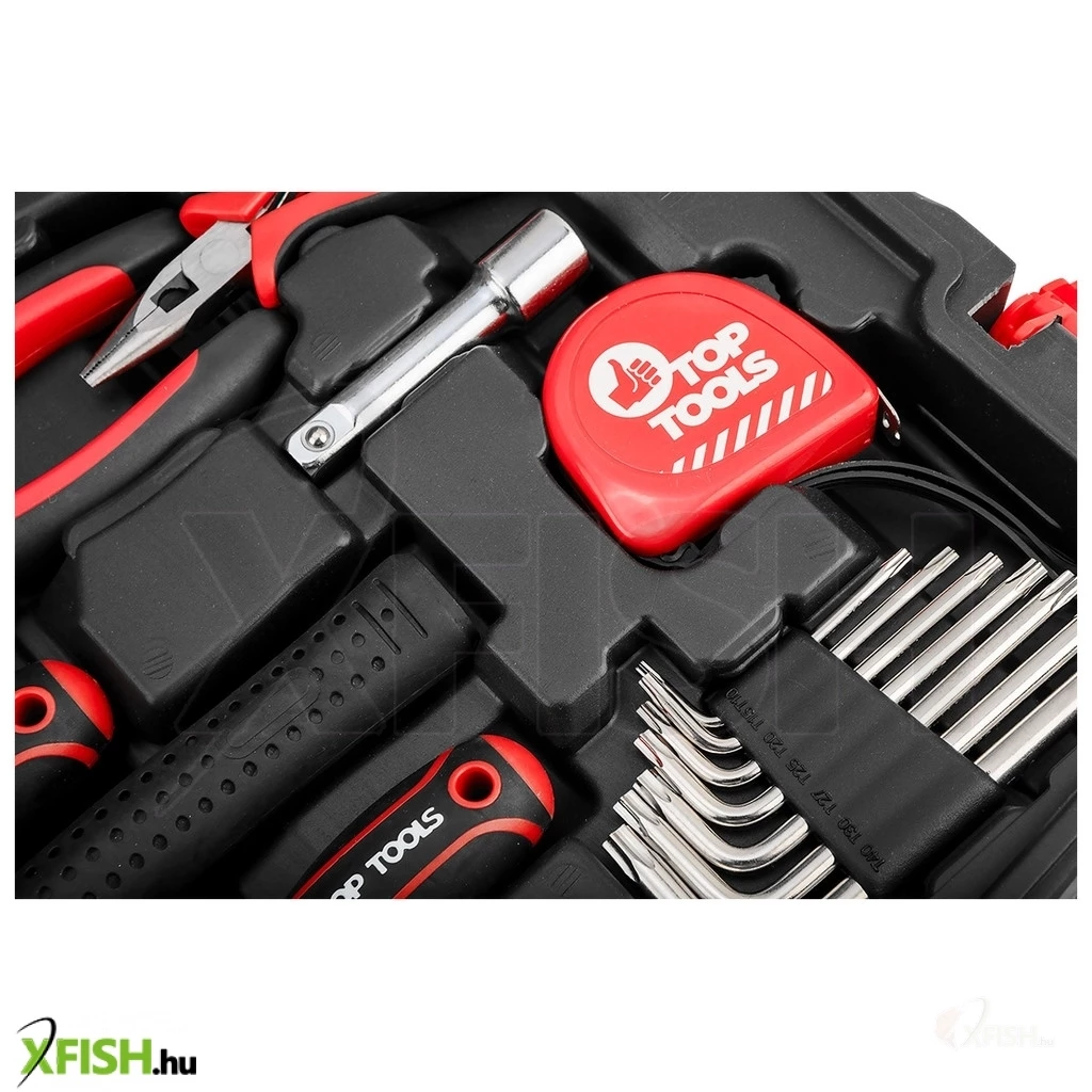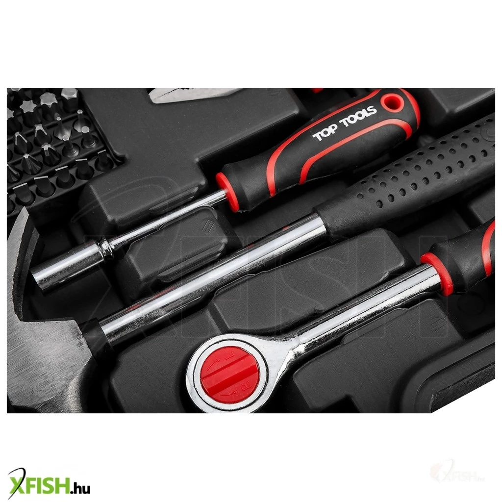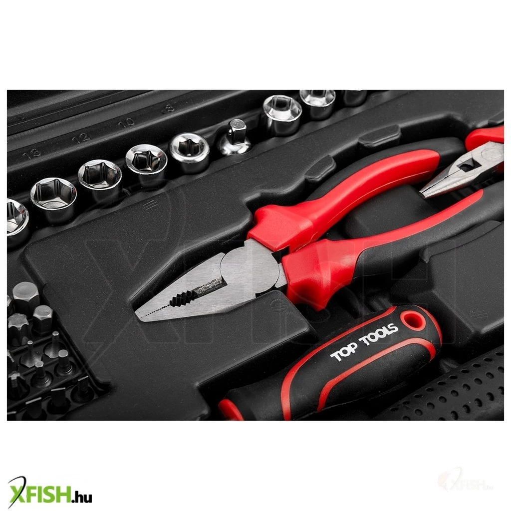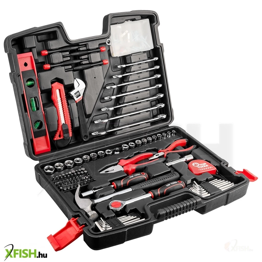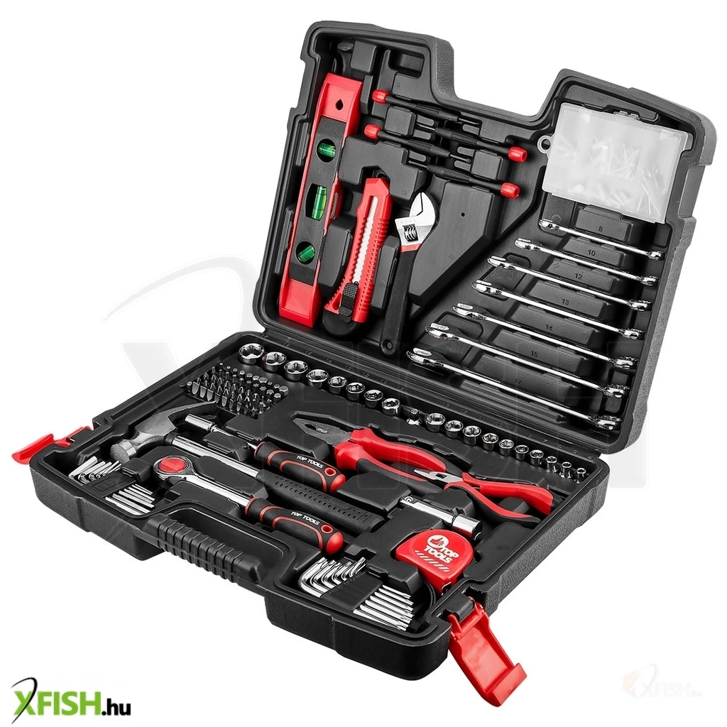 Szerszámkészlet (ref. 38D545) 1/4 ", 3/8" felső szerszámok. Anyag: szénacél. A készlet tartalmaz: 8, 10, 12, 13, 14, 16, 17 mm lapos gyűrűs kulcsokat, Bitek: T8, T10, T15, T20 T25, T27, T30, T40, T45, H6, SL3, SL4, SL4,5, SL5, SL5,5, SL6, SL6,5, SL7, SL8, H5, PZ0, PZ1 , PH2, PH2, PH2, PH2, PH3, H1,5, H2, H1 / 8, H9 / 64, H5, PZ2, PZ2, PZ2, PZ2, PZ2, PZ3, H2,5, H3, PH0, / 32, H3 / 16, H7 / 32, H1 / 4, H5 / 16, H4, H5.5, H8, egyszerű raszter 3/8 "185mm, kiterjesztés 3/8 70mm, adapter 3 / 8Fx1 / 4M, csatlakozók 3/8: 8, 10, 12, 13, 14, 15 16, 17 mm, 1/4: 4, 5, 6, 7, 8, 9, 10, 11, 12, 13mm sapkák, csavarhúzó tartó 1/4, 2 m-es mérőedény, állítható kulcs 150mm, univerzális fogó 165mm, precíziós fogó 125m, kalapács 300g, összecsukható kés, precíziós csavarhúzók: PH0, PH00, SL0, SL00, 230mm, hex kulcsok a tartóban: 1,5, 2, 2,5, 3, 4, 5, 6 mm, Torx kulcsok a tartóban: T10, T15, T20, T25, T27, T30, T40, műanyag doboz normálokkal: (Gang 1.4mmx25mm x49) (fúrókorong 1.6mmx39mm x17) (x5 miniatűr) (csavar 3mmx21mm x8) (csavar 4mm x 27mm x6) (rögzítés x5 körömre).