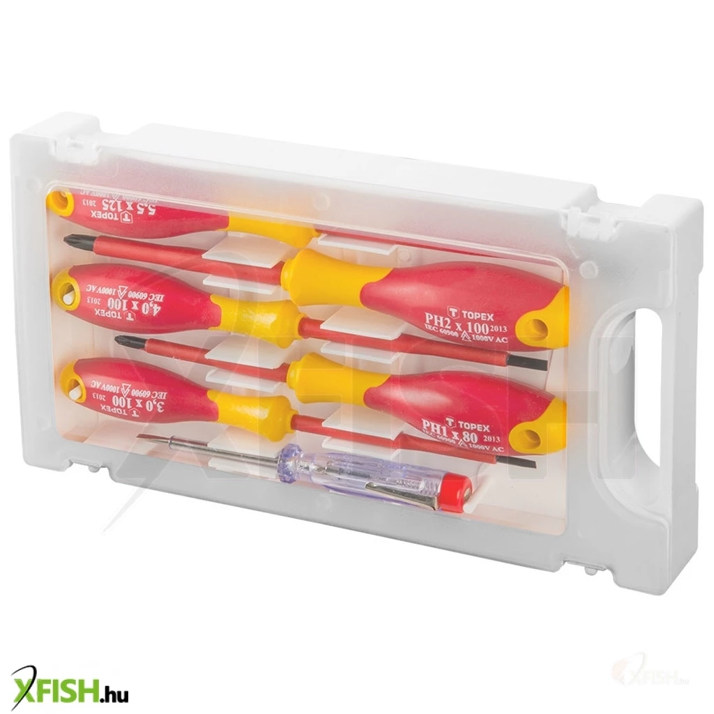 Csavarhúzó 1000 V, 6 dbOos készlet, tanúsított, CrMo acél, bimateriál markolat, méretek: 3 x 100 mm, 4 x 100 mm, 5,5 x 100 mm, PH1 x 80 mm, PH2 x 100 mm, fázisceruza 125- 250 V
