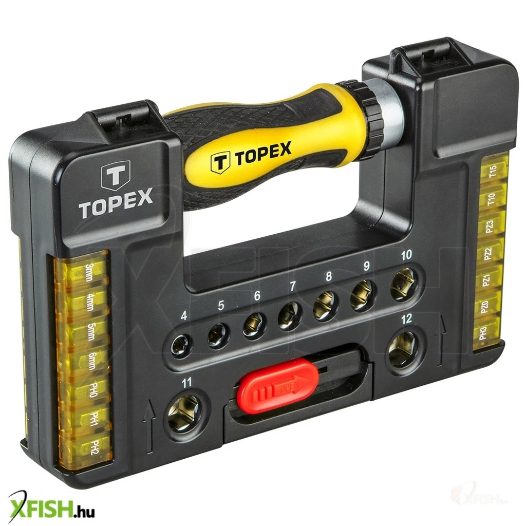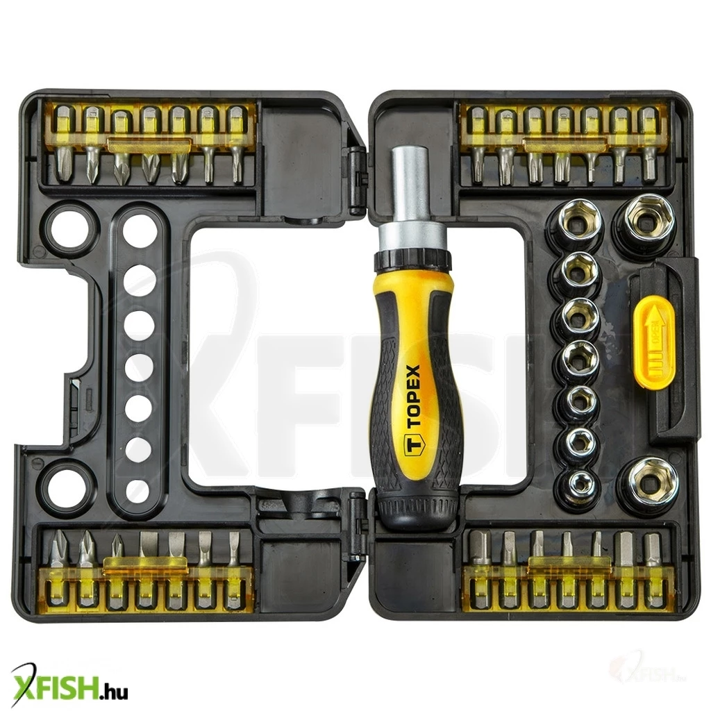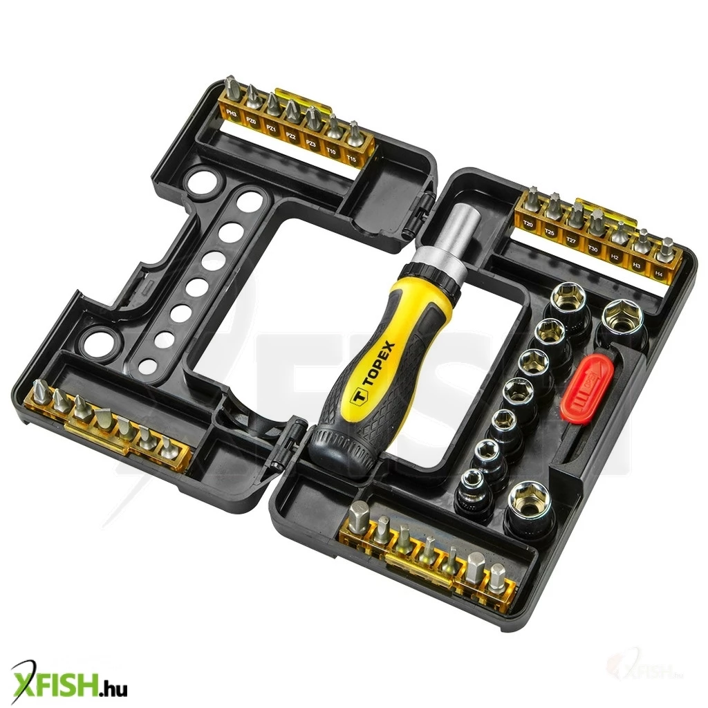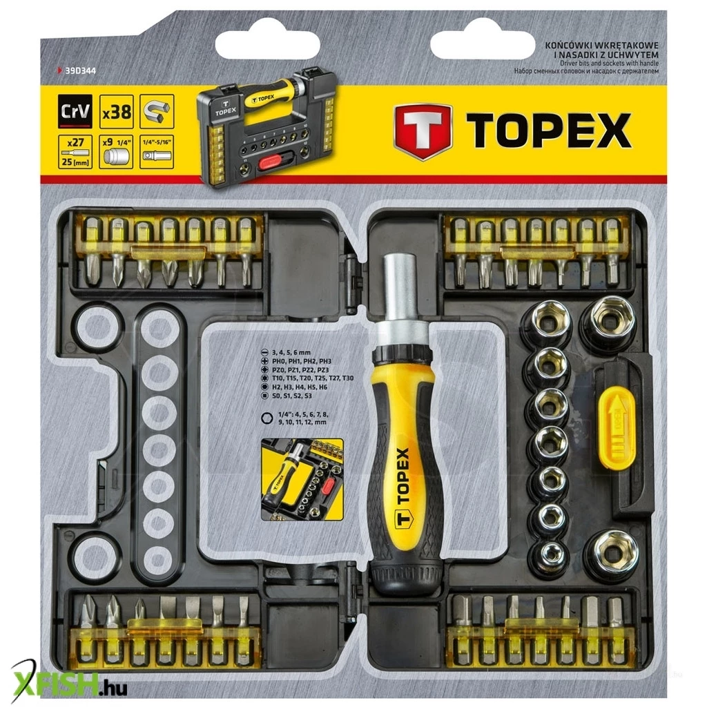 Csavarbehajtó bitek és dugókulcsok hajtókarral (ref. sz. 39D344, 1/4", mágneses racsnis hajtókar, 1 adapter, 9 db dugókulcs, méretek: 4, 5, 6, 7, 8, 9, 10, 11 mm, 27 db csavarozó hegy, méretek, lapos: 3, 4, 5, 6, mm, kereszt PH0, PH1, PH2, PH3, PZ0, PZ1, PZ2, PZ3, Torx: T10, T15, T20, T25, T27, T30, Hex H2, H3, H4, H5, H6, S0, S1, S2, S3 CrV acél, műanyag csomagolás
