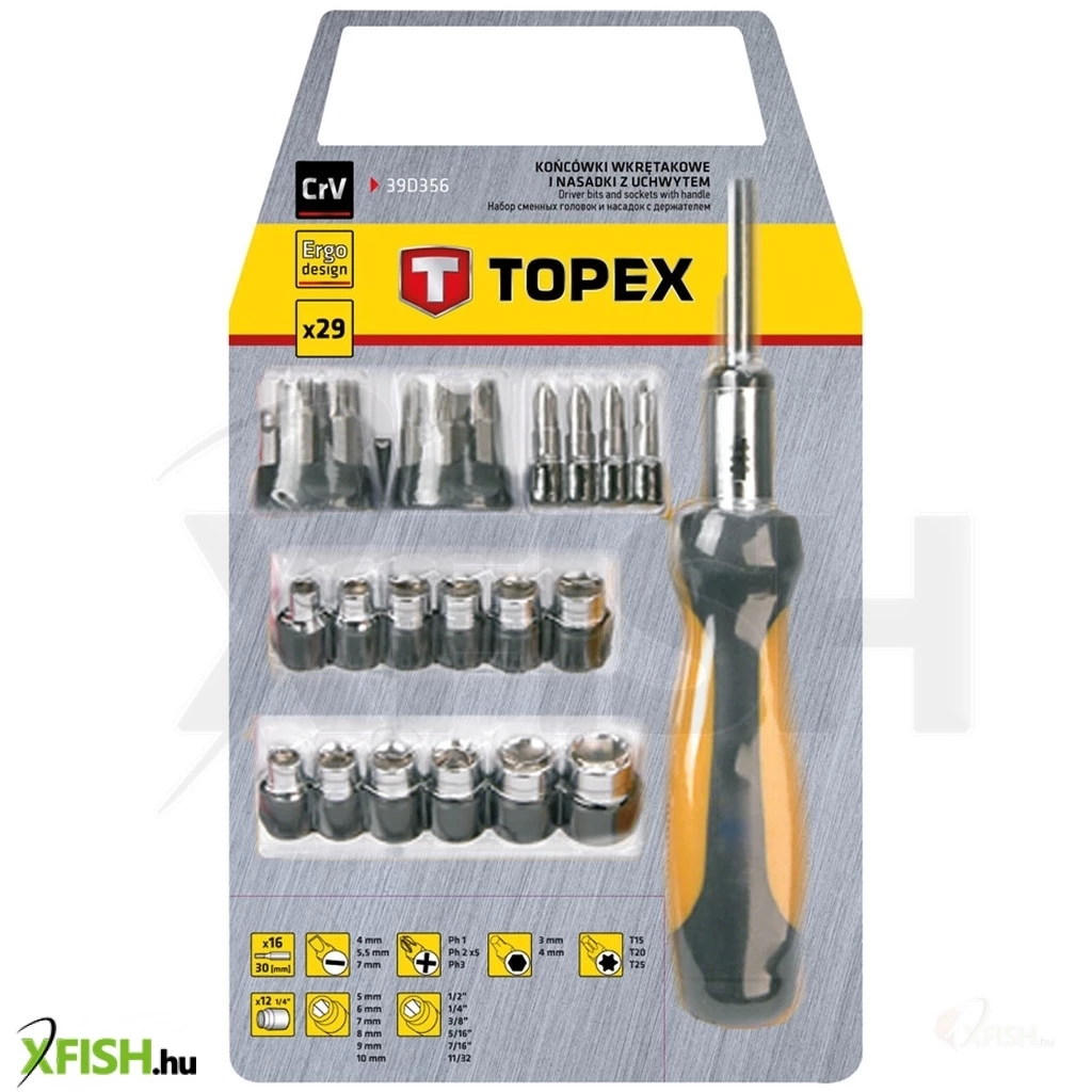 Csavarhúzó bitek és dugókulcsok hajtószárral, 29 db-os készlet, 1/4, mágneses bit befogószár, 6 db metrikus dugókulcs, méretek: 5 mm, 6 mm, 7 mm, 8 mm, 9 mm, 10 mm, 6 db colos dugókulcs, méretek: 1/4, 5/16, 11/32, 3/8, 7/16, 1/2, 15 db csavarhúzó bit, méretek: lapos 4 mm, 5,5 mm, 7 mm, kereszt PH1,5 x PH2, PH3, Torx: T15, T20, T25, hatlapú H3, H4, közdarab 10 mm x 1/4, CrV acél