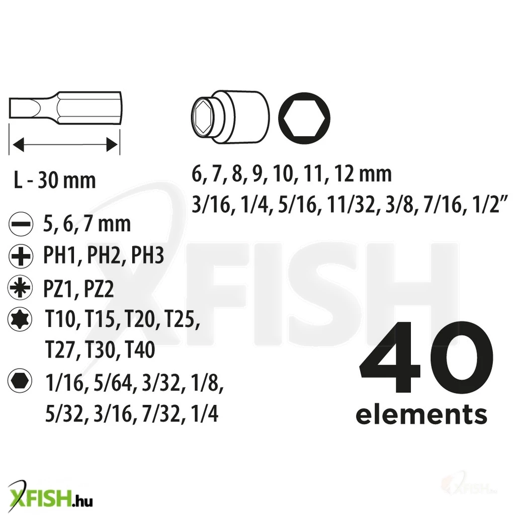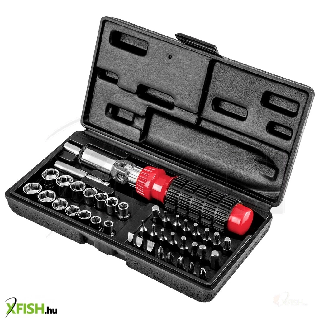 Csavarhúzó bitek és dugókulcsok hajtószárral, 40 db-os készlet, 1/4" szűkítő, 100 mm-es hosszabbító, racsnis hajtószár, csavarozó bit, méretek: lapos 5 mm, 6 mm, 7 mm, kereszt PH1, PH2, PH3, Torx T10, T15, T20, T25, T27, T30, T40, Hex 1/16", 5/64", 3/32", 1/8", 5/32", 3/16", 7/32", 1/4", hatlapú dugókulcs, méretek: 6, 7, 8, 9, 10, 11, 12 mm, 3/16", 1/4", 5/16", 11/32", 3/8", 7/16", 1/2"