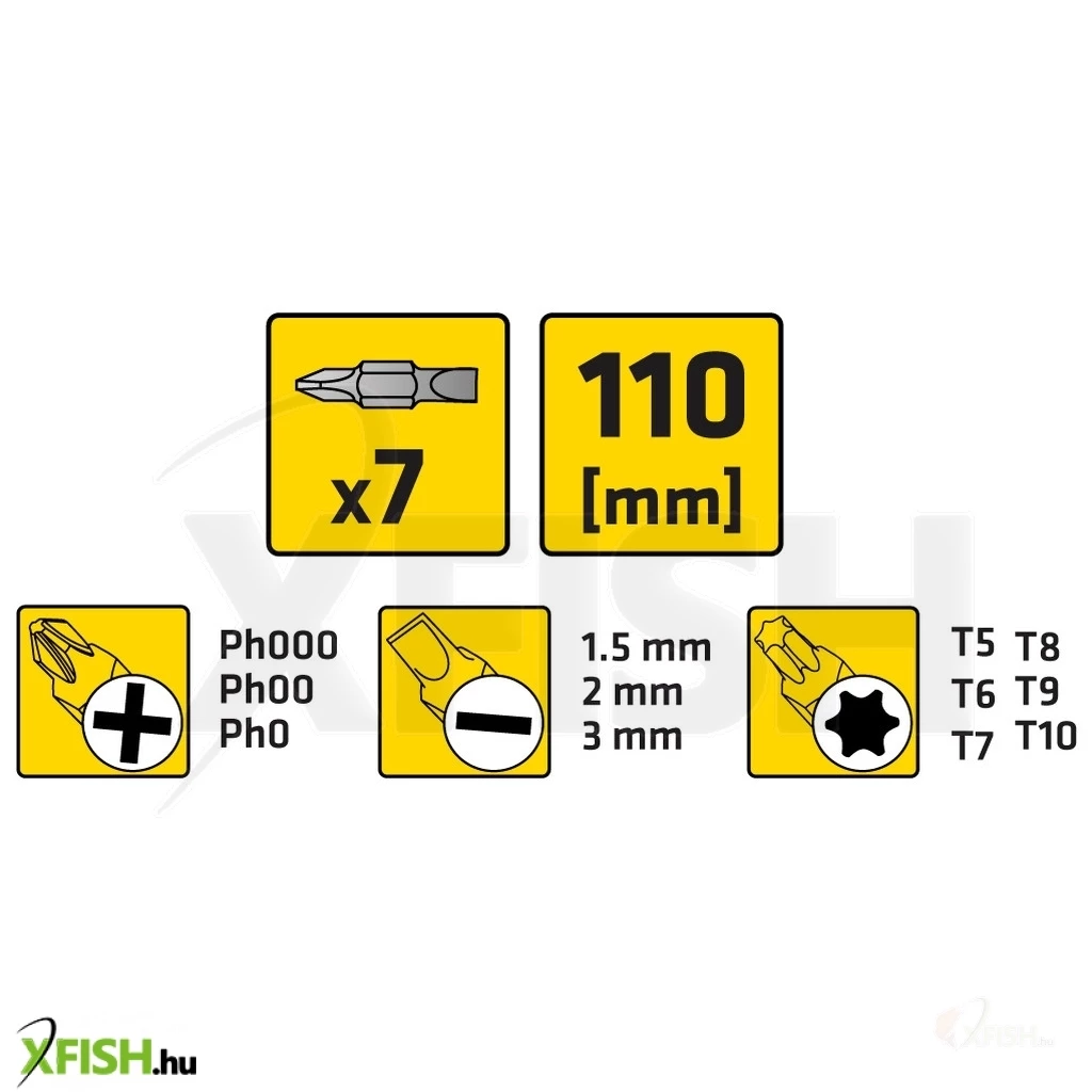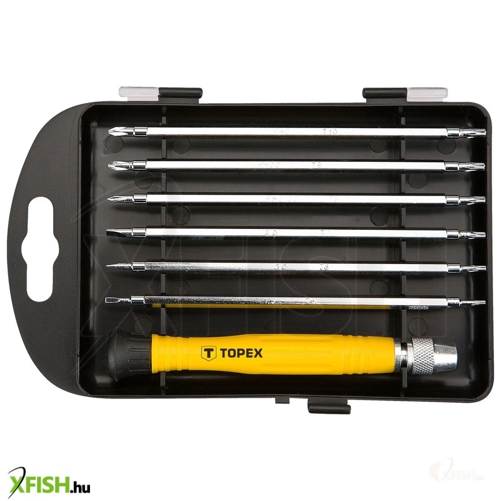 Műszerész csavarhúzó klt. 7 dbOos, csavarhúzó markolat, 6 db kétoldalas csavarhúzó penge, méretek: 1,5 mm x T5, 2 mm x T6, 3 mm x T7, PH000 x T8, PH00 x T9, PH0 x T10, CrV acél