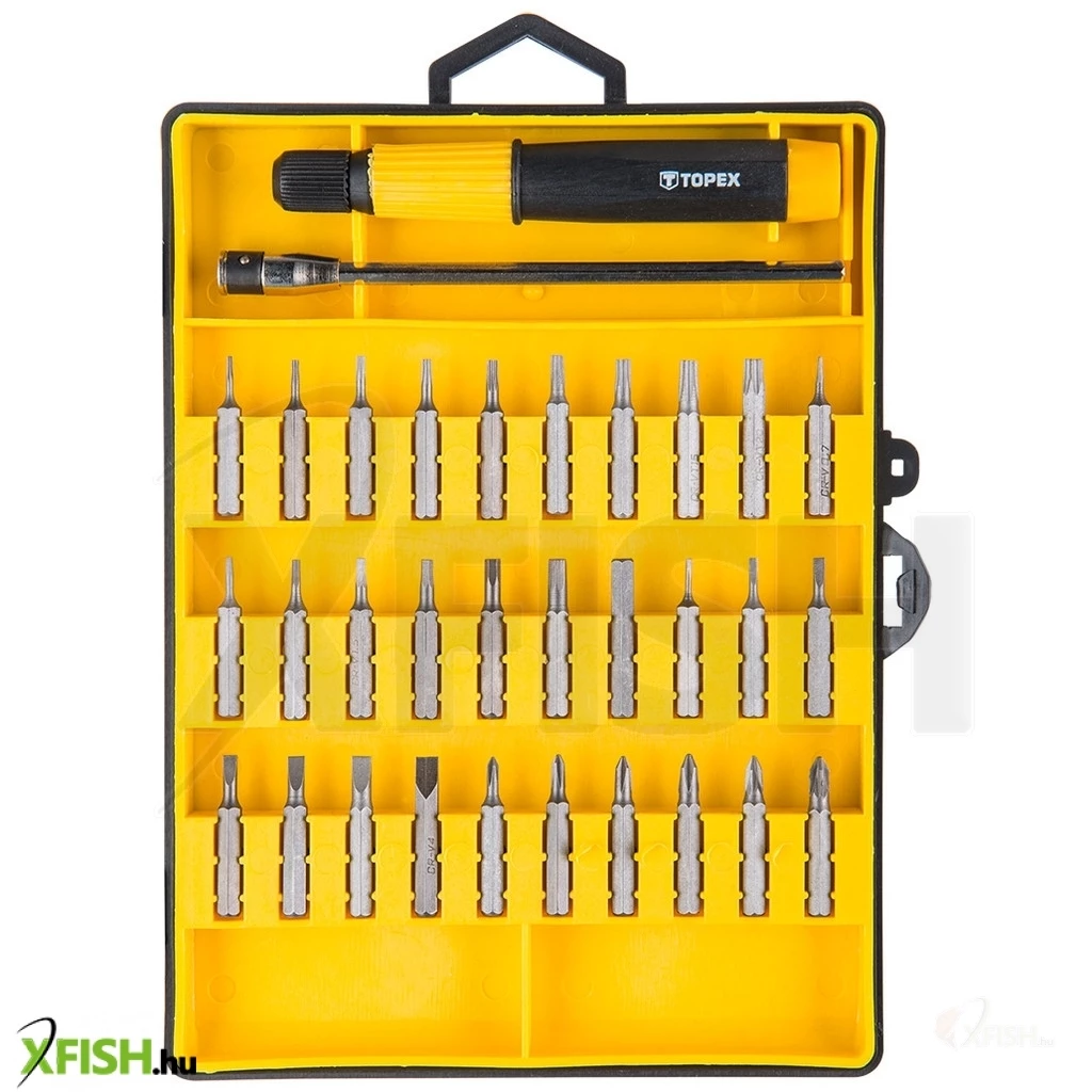 Műszerész csavarhúzó bitek befogószárral, 32 db-os klt., befogószár, hosszabbító, 30 db 30 mm-es, műszerész csavarhúzó bit, méretek: lapos 1 mm, 1,5 mm, 2 mm, 2,5 mm, 3 mm, 3,5 mm, 4 mm, kereszt PH000, PH00, PH0, PH1, PZ0, PZ1, Torx T4, T5, T6, T7, T8, T9, T10, T15, T20, hatlapú H0,7, H0,9, H1,3, H1,5, H2, H2,5, H3, H4, CrV acél, műanyag tok